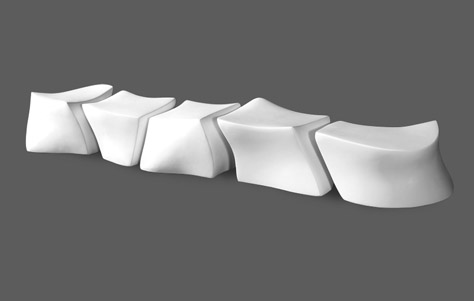 Marie Khouri, designer/artist/sculptor and Creative Director of Collaboration, first debuted this collection of hand-carved laminated wood benches last fall at IDS West. This marvelous month of May finds her back in the limelight, this time as a participant in the ICFF Furniture Fair. The initial incarnation of L5 was a wood purist’s dream. The assortment of individual elements showed the beautiful striations, the lovely grains, the tactile temptations of smoothly polished veneer. This time around, she’ll be showing a more modern take on L5. The latest version is made from GRFC (lightweight concrete). It’s very bright and gleaming white—perfectly duplicating the look of a yet intact array of sun-bleached bone. The aesthetic of the newest L5 is dead-on for the spacious and brightly-lit interiors of art galleries and museums, but it will definitely turn heads regardless of where it’s installed, no matter what space it graces with its intrepid backbone.
