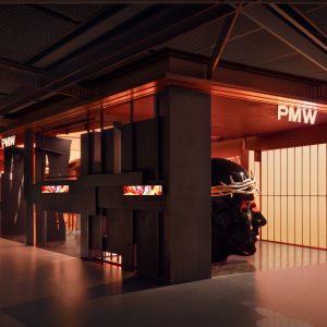 Black floor tiles as well as the mural coloured metallic platinum silver complete the warm, comfortable and well-selected ambiance. Eyecatcher is a centered round lounge with a round white leather sofa based on a golden floor area, indirect ceiling lighting and drooping bowl elements. Ceiling lights arrange for variable illumination.