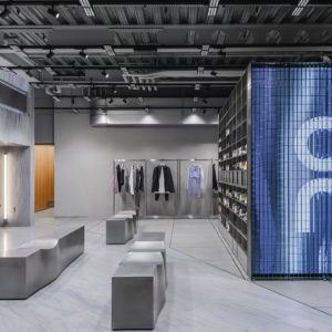 Like a cave dug in a cliff, or fossils hundreds of millions years old trapped in lava, when something is buried in another entity, it constitutes an inseparable whole with the background. By applying a similar concept to a shop display at Diesel Shibuya, Beijing-based architect Yoshimasa Tsutsumi has developed an installation method where goods and space are fused with each other.