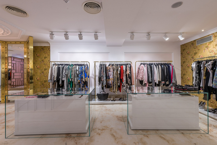 On the basement we can see mens collection and the interior style is more modern and strikle. Wooden floor and black metal handle railings are the main decorative elements. On the first floor hosts the casual women’s clothing, which has invested flooring with wood in gray shades and on the ceiling have been placed black wooden beams. On the second floor there is the brand name women clothing and identifies a more luxurious decoration. The flooring coated with marble tiles and ceilings decorated with stuccoes.