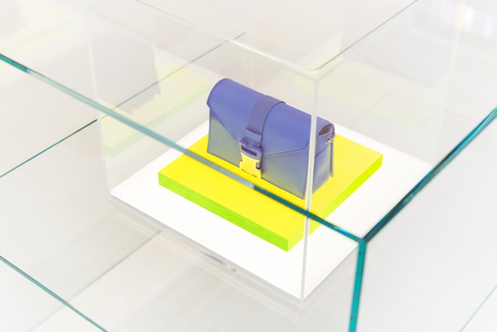 The Scottish fashion designer – among the most promising names from the British scene – has put his first step on the retail ladder, positioning himself on London’s Mount Street, the new mecca for luxury shopping. The store is located in a characteristic red brick Edwardian building, and occupies 380 m2 over two levels. The main floor hosts the shoes, leather goods and the women’s ready-to-wear collection, tidily displayed on transparent shelves, or hanging from translucent Perspex rails. A minimalistic yet dramatic staircase, developing around a totem-lamp made of slim glass cylinders, is the way down to the lower ground level, home to the menswear line and to fitting rooms with mirrored doors.