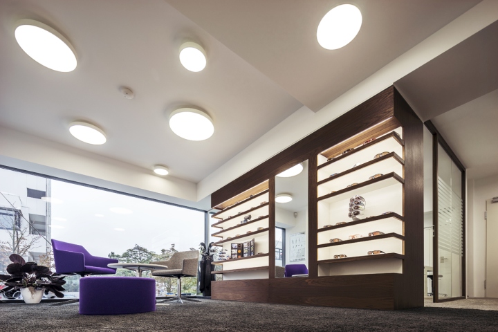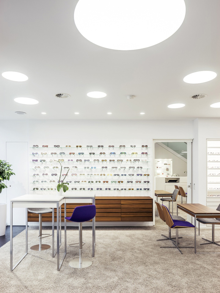 Hamburg based architecture office STLH Architekten were commissioned to redesign comprehensively the optician store “Klinke Optik” in Oberursel, nearby Frankfurt. The project also included the extension of the shop area by creating a new connection to the second floor of the 6-story high building as well as a new façade to make the new shop and its size visible from the street. Thus the shop area has been doubled. The new opening in the ceiling is emphasized by a two-story water feature.