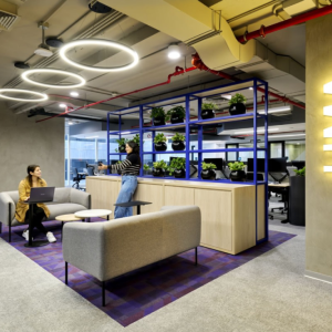 Open and closed communication areas, as well as retreat areas are positioned along the middle zone, to create a communicative center and to avoid an overlapping with focused working. Even in the multi-functional Sky Lobby this design concept continues. The textile room divider enables variable zoning and interaction with lighting and graphics generating diverse atmospheres. A railway related artistic and abstract graphic can be modified with color changing RGB light. Depending on the light color, the graphic changes by the neutralization of the colors. The graphic image starts to move and changes according to the light and is used both statically or dynamically dependent on the event.
