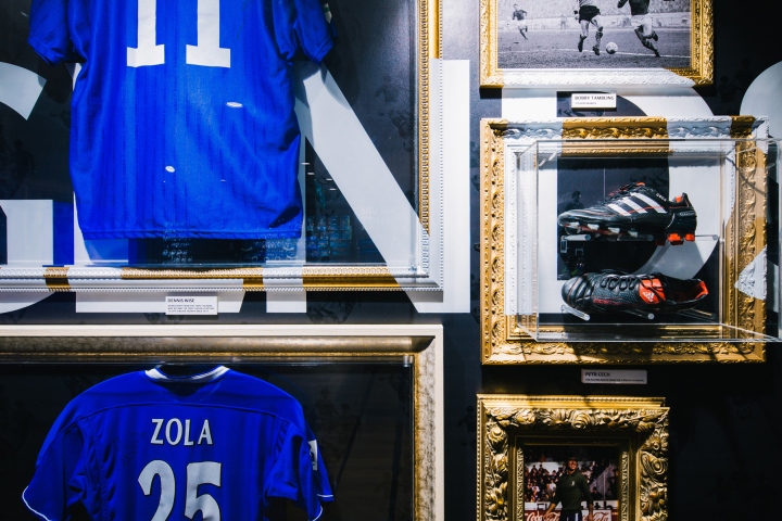 A full flat external facade in blue enhances the visibility and findability of the store and turns the fanshop into a real place of pilgrimage for the “Blues“. Inside the focus rests on the football world experience; the brand design builds the graphical bridge from tradition to innovation. Photo collages of players become a modern baroque wall paper and logo elements as the football are reanimated with a vibrant Pop Art look. The “look and feel“ is functional, rough and reduced on the essentials.