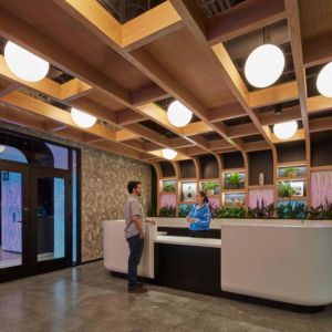 Stuart Church, the designer of the complex was responsible for everything from the overall site plan down to the delicate floral patterns in the coffered ceilings. He found architectural influences for the layout of his main block in the galleried courtyards of the Taj Mahal Palace Hotel in Mumbai.
