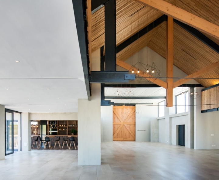 The latest addition to the expansive estate hosts a wide range of events including weddings, launch parties, conferences, and more. It was essential that the interior be both stylish and inclusive, traits that led to the selection of a neutral aesthetic utilizing such materials as oregon pine and weathered-plaster paint. Considered integration of natural light by floor-to-ceiling glass windows strengthens connection to the landscape and emphasizes warm wooden hues found within.