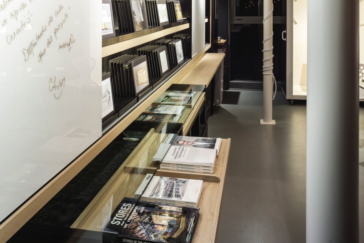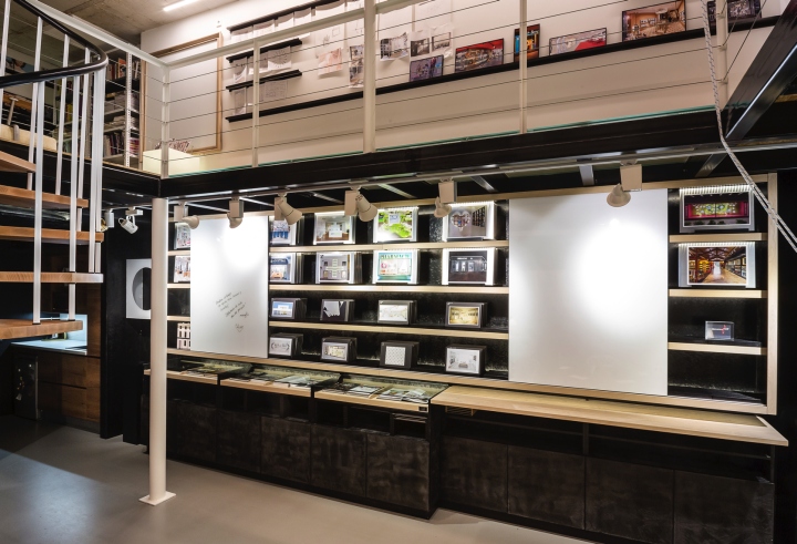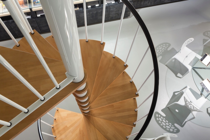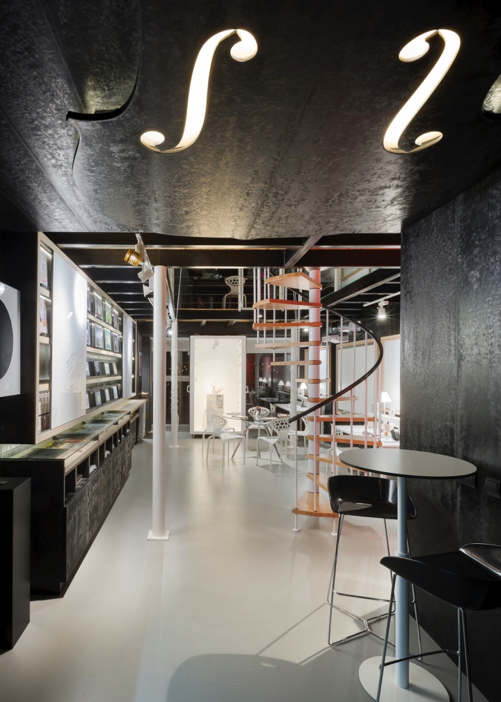 Presentation and Prototyping: Marketing-Jazz’s raison d’etre is creativity: coming up with the right idea to create a successful commercial space. We love our ideas and completed projects to be seen clearly. We have designed a 5.5 metre-tall shelving unit to be able to present, conceal and write down the first thing that comes into our heads. As well as that, we have a space for preparing mock-ups of prototypes, which is a display space for visual communication campaigns before we bring them to the point of sale. A spiral staircase leads to the upper floor. This floor is used for working in silence, for inspiration, documentation and filing.