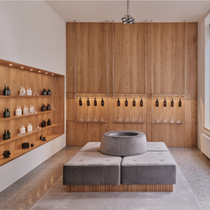 The timber on the floor is girdled with a strip of marble in varying shapes and elegant pathway tiles leading from the entrance to the service counter. The teal color on the walls and the white ceiling illuminates the space and balances the hardness of the metal to highlight the products. Another distinctive element in the decoration of the pharmacy is the wooden door shaped poles that are interiorly lighted to promote individual products.