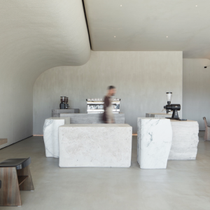 The showroom is arranged freely around the new furnishings which enclose the existing pillars and the restrooms, while the area including the office and the meeting room is separated from the exhibition, though being in direct connection with the rest of the space.