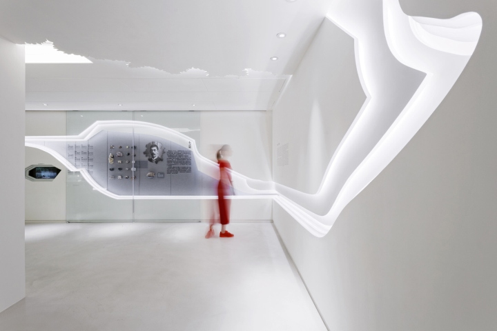 Central room, Taiwan’s New Scopes. This white space, along a corridor, displays the major findings through the history of the museum. Playing with the abstraction of natural patterns and forms, the scenery is a tribute to all these specimens extracted from nature in the service of collective knowledge, in addition to their genuine beauty. Each of the showcases is dedicated to one of the researchers who contributed to the history of the collections, displaying their major findings. In this whiteness and an atmosphere of warm wind music and under the patterns of arboreal shadows, a wall reveals in its thickness a number of images and stories about the building itself through the decades.