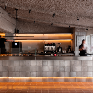 We designed this store using wood and metal in bright colors. Simple and elegant.