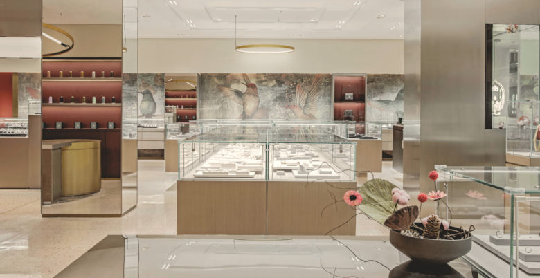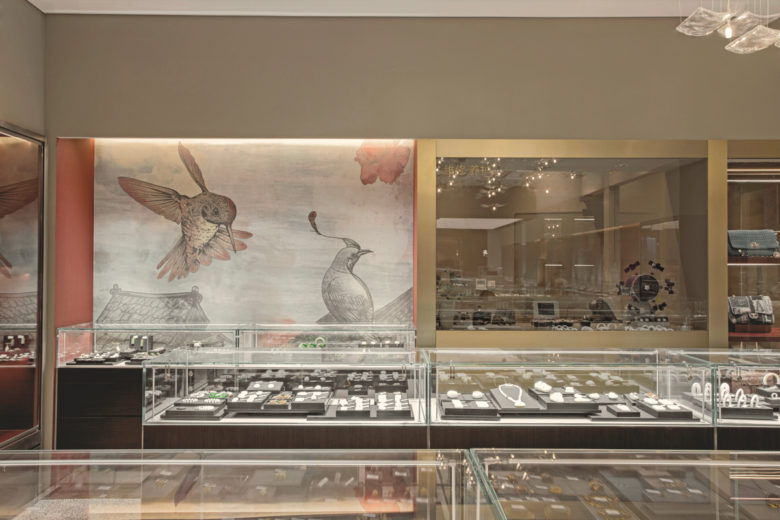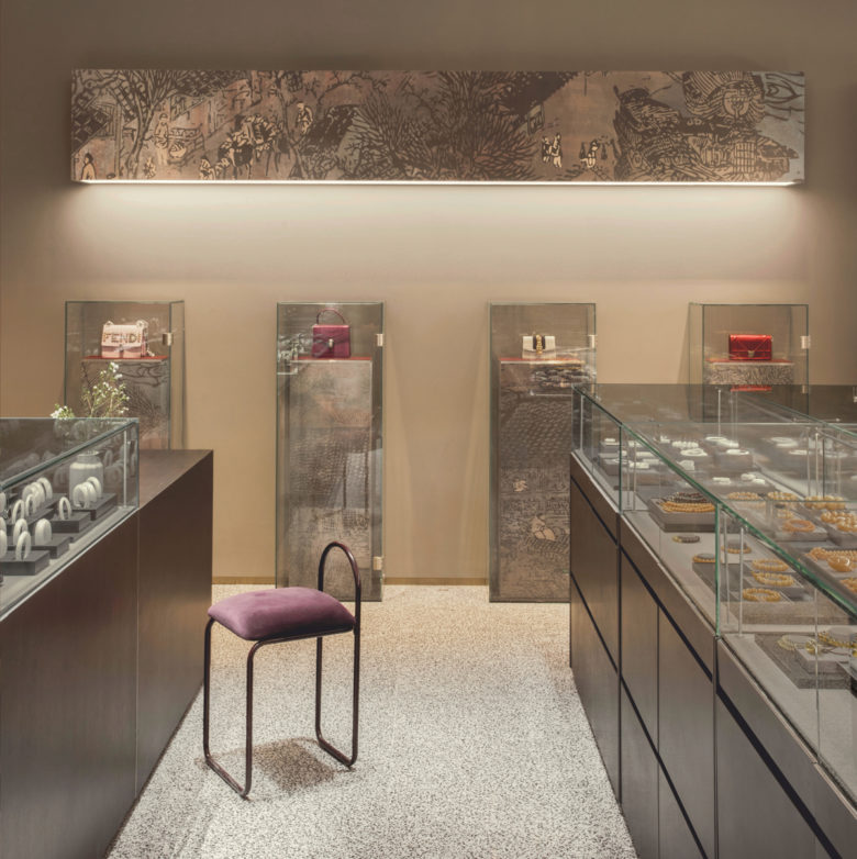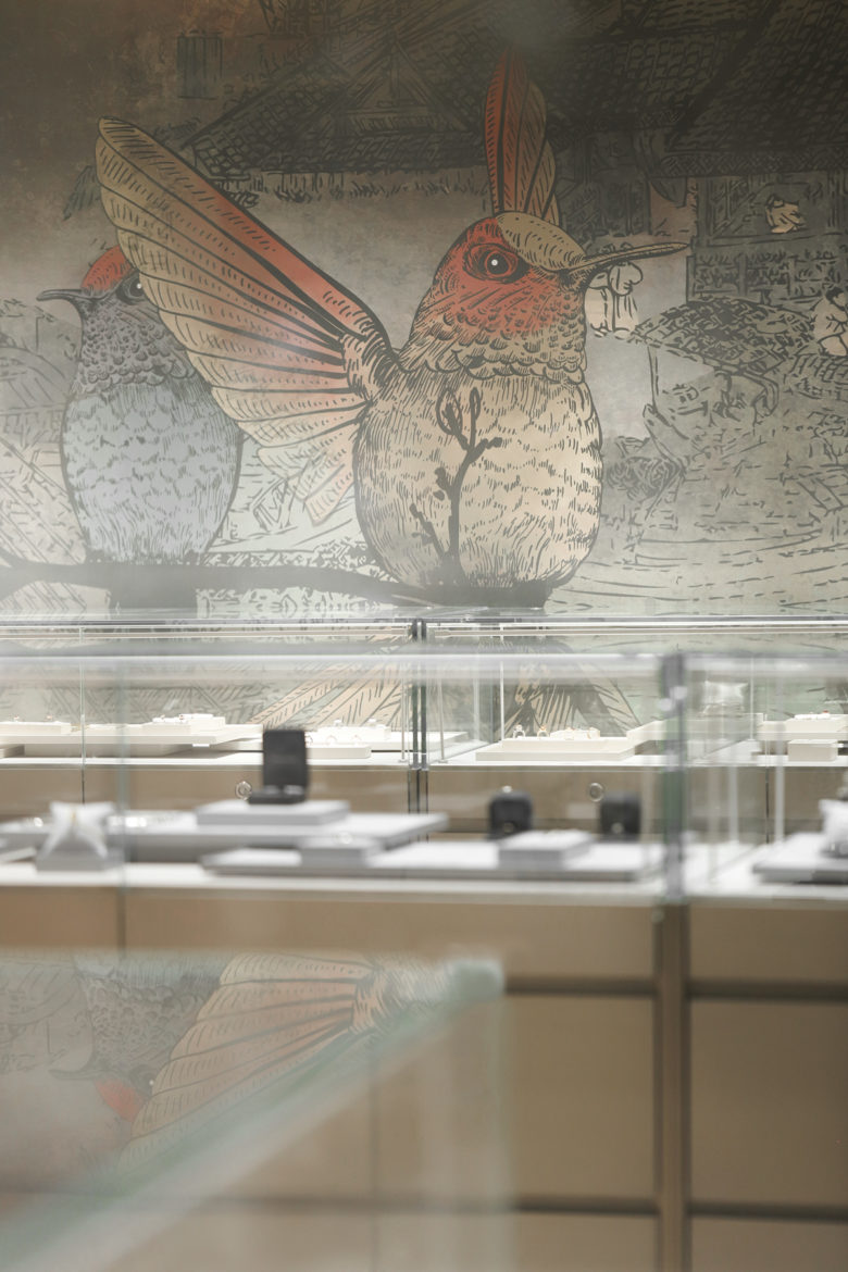 PINZHEN GALERIES is a jewellery and luxury goods distribution and service platform. For the new flagship store in Beijing, STUDIO8 created a linear gradient change from the entrance to the back of the shop. The color of the spaces and the material of the props change from light to dark, cold to warm and contemporary to traditional, subtly guiding consumers to areas that are most in line with their own tastes. the store takes the phoenix as the logo for the new brand image, in reference to “The Immortal Riding a Phoenix”. Inspired by traditional paintings, the custom-made wallpaper runs through and connects the entire shop like an unfolded Chinese scroll, telling the story of the brand and paying tribute to traditional Chinese culture.
