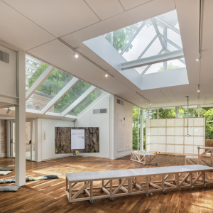 Moulded-panel back wall and large floor-to-ceiling windows are lined with sleek metal shelving, and furnishings are relatively sparse, featuring only two main settings of which a semi-secluded jewellery section with curved partitions, black stilted cabinets and intricate mosaic tile flooring stands out. Interestingly, many a furnishing incorporates elements of Japan‘s Ajiro bamboo weaving technique and has been especially made for this store, mixed and matched with Gucci‘s eclectic retail aesthetic. A swirling staircase, clad in mirror panels, leads to the second floor where the men’s collections are presented. Here, the backdrop is similar, but the settings, although being distinctly lavish, flaunt a colour palette that’s a tad more demure. The circular fitting rooms with floral curtains tie in with a seating area in the middle of the space.