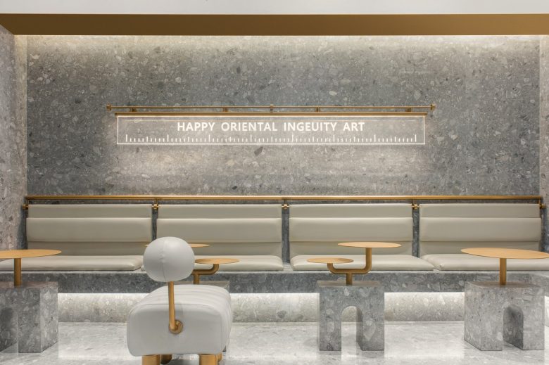 The interior space takes on the rational keynote of modernism. The grey big grain stone and golden stainless-steel form the material contrast, achieving the balance of roughness and delicacy. The integration of natural stone makes it present the classic yet artistic style of the space.