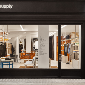 In contrast with the metallic interiors, wood and straw acoustic panels are applied to the rest of the retail furniture, while a long piece of traditional Korean Ramie fabric is draped on the wood-beam-like pendant lamps that run across the length of the retail, adding warmth and softness to the space.