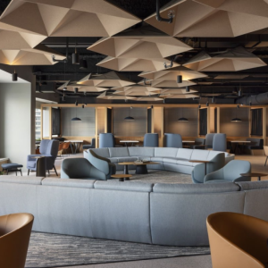 With a simple and natural green as the dominant tone, complemented by large areas of vermilion fabric wall coverings, the overall ambiance creates an elegant and rustic eastern atmosphere. At the entrance, the green-black marble floor and vermilion-red wall form a striking contrast, captivating the visitors. These two highly contrasting colors are boldly and unapologetically displayed, showcasing the grace and magnanimity of the entire Chinese culture. Upon entering the lobby, the orderly arrangement of linguistic forms interprets the design’s breaking and reconstruction of ceremonial and formal structures: a sequence arranged along the axis → the use of vertical cylindrical blocks. In breaking the traditional mold, a new order is constructed, seeking harmony in the diversity of spatial forms. In terms of lighting fixtures, a variety of palace-style lamp shapes have been selected, harmonizing with the ancient charm and elegance of the space. As you ascend the steps to a higher place, you encounter the color green once again. Within the warm vermilion aura, the road paved with bluestone seems to gently recount past stories. Each private room is adorned with narratives that whisper in your ears, some elegant and refined, others vibrant and rich, and some warm and lovely. In the sky-blue misty rain, it’s the anticipation by the vast window, and it’s also the vision of a bright future by the heroic riverside. The river’s reflection, framed through the glass, captures your figure.