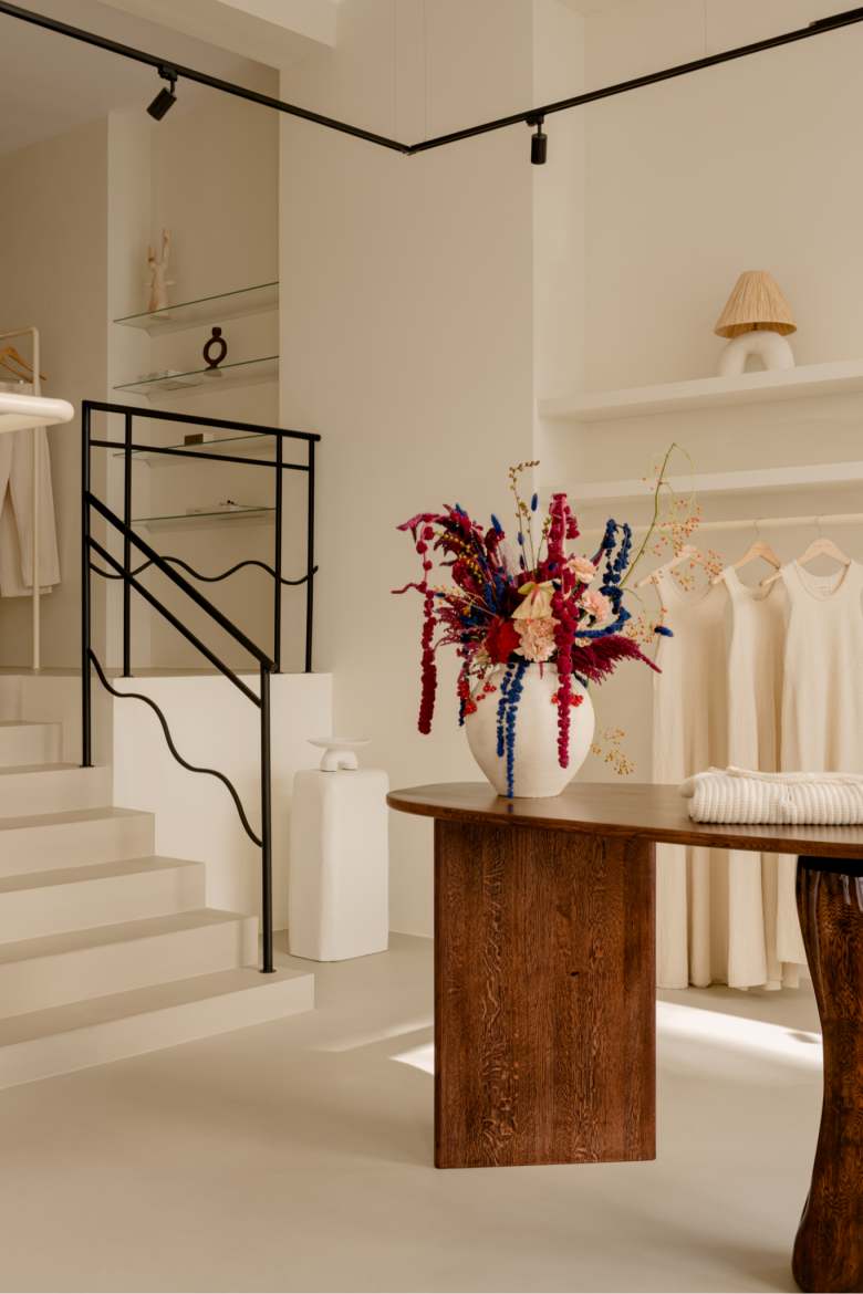 The ethereal backdrop is counterbalanced by a robust sales desk in a high-gloss off-white hue, dark timber shelving and a striking display table. Mind you, the latter two furnishings have been meticulously crafted by wood artisan Bartłomiej Stawiński. Additional bespoke elements include a black steel wavy staircase rail and curated vintage furniture, such as Danish mid-century chairs and a leather sofa. Interestingly, the design is also a reference to the 1960s store interior of Moda Polska, a Polish state-owned fashion company which translated trends in world fashion in the state clothing industry for four decades until 1998. The new Bohèmi Soul flagship store stocks the full range of apparel, accessories, cosmetics and jewellery. © superfuture