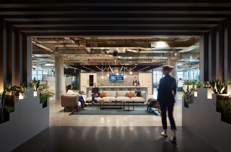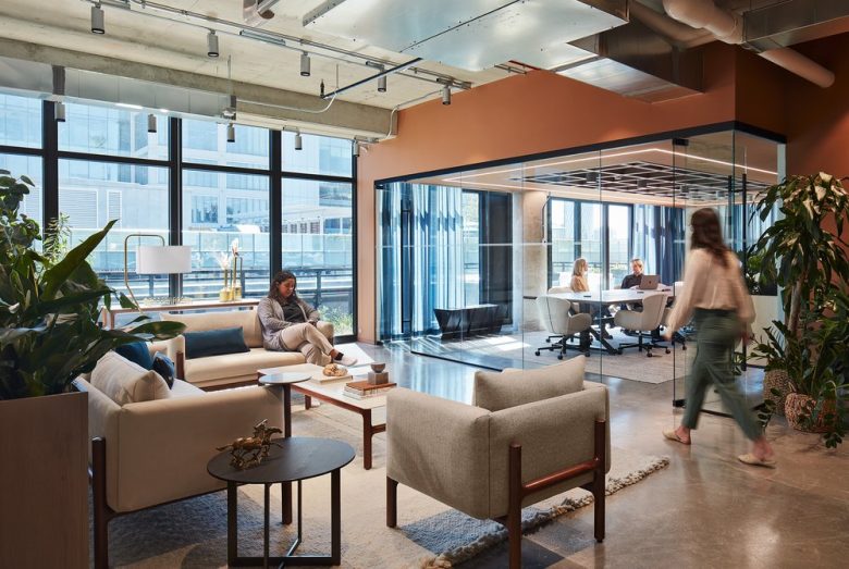 A two-sided volume defines the center of the plan; hospitality bar on one side, design studio on the other. Visitors circulate around this central mass exploring different vignettes – lounge, collaboration, heads-down, wellness – while in constant dialogue with the outside.