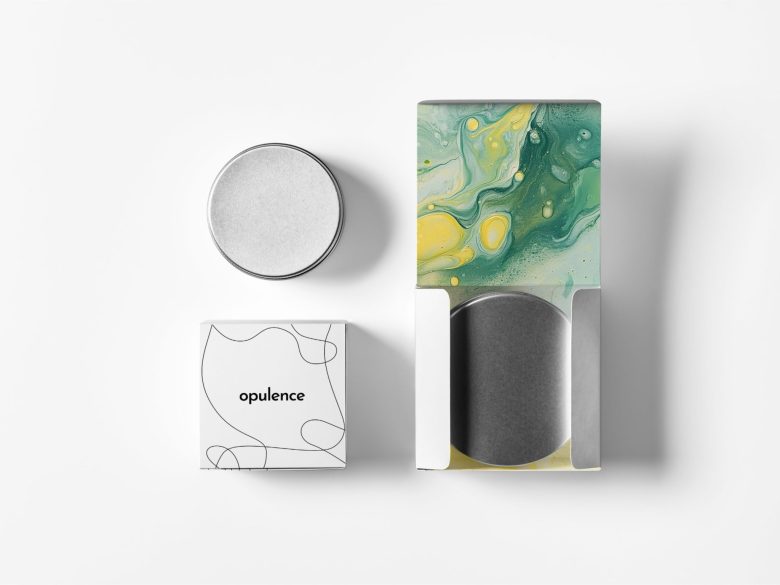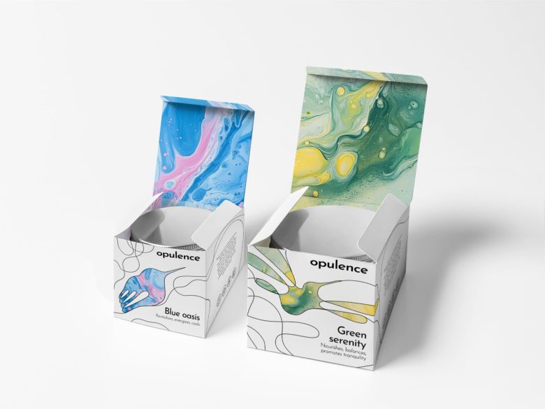 The packaging plays with geometric contrast — sharp-edged square boxes versus smooth, oval jars. The crisp lines and flat surfaces of the boxes provide a striking backdrop for the intricate hummingbird motifs, while the jars’ rounded shapes offer ergonomic comfort.