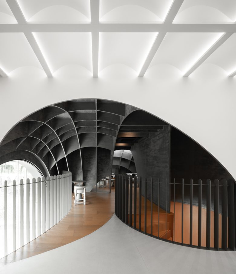These layers of volumes differ in size, urging the customers to explore the “sequence of volumes”, imitating the spatial atmosphere of caves. The negative spaces created through the formation of volumes are filled with an interlocking waffle structure with various spacings, but are presented in the same textured dark gray tone to exude a natural stone surface in caves. The lighting is designed to be within the grids of the structure, highlighting the central foyer, which is the main area from the entrance. The foyer then flows into other areas of different volumes within the building. A mezzanine floor is added for a more private seating area while at the same time, also creating another zone for customers to explore.