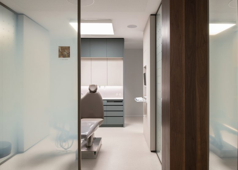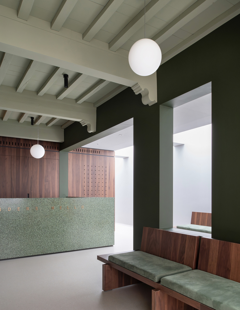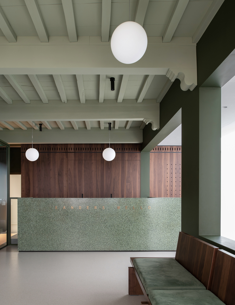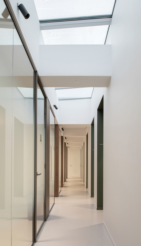 The orthodontic clinic offers space for eight treatment rooms and all necessary supporting facilities. The interior layout has been carefully redesigned, preserving as many historical elements as possible and complementing them with modern, functional interventions. The new extension, measuring approximately 400 m², is designed to maximize natural light. A skylight has been installed in the roof along the axis of the main entrance, providing ample daylight to the adjacent corridor and serving as a natural wayfinding element to help visitors navigate the building. Separate circulation routes have been created for patients and staff, contributing to a hygienic working environment and a calm, serene atmosphere. Visitors enter the building through the new entrance; to the left is the polished concrete reception desk and the entrance to the monument section, which houses the practice’s waiting area. Here, the original brick walls have been left exposed, and the ceiling is painted in the original light green color.