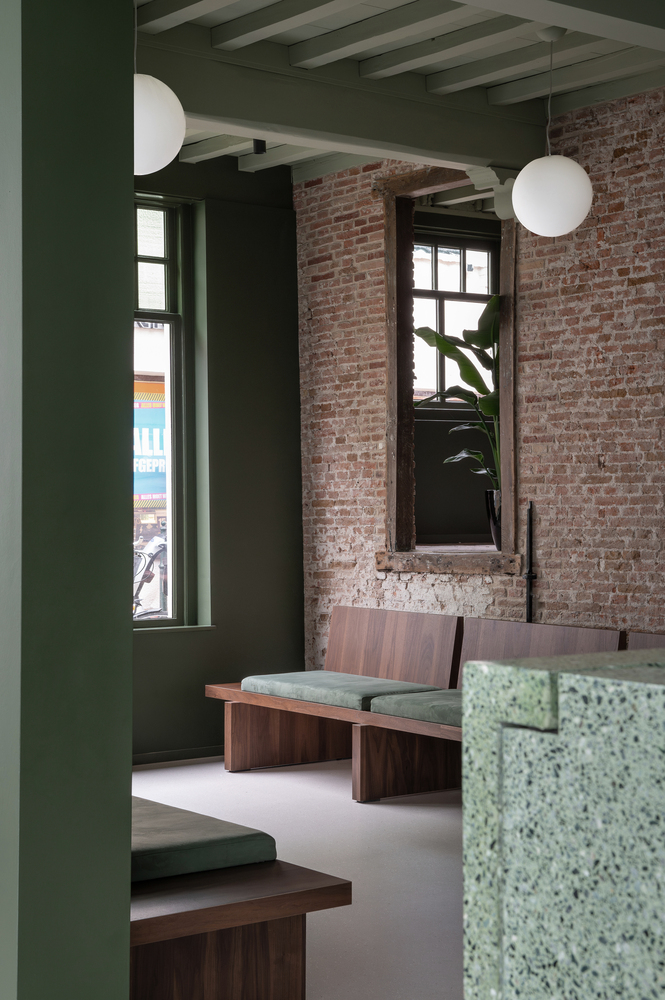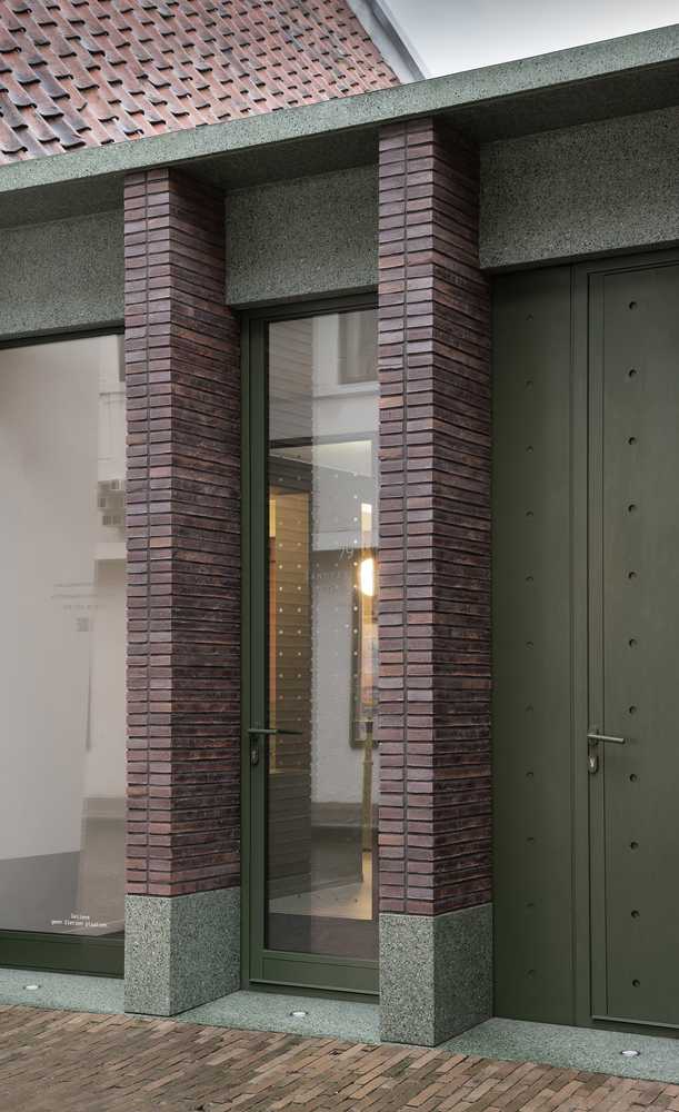 The front façade is defined by a tripartite layout, consisting of two dark brown brick piers that align with the color of the original bricks of the monument. Between these is a glass wall that maintains visibility of the 17th-century building’s contours from the shopping street. The entrance, centrally placed between the piers, is made of a glazed steel frame powder-coated in the shade of “earth green.” The adjacent access to the fire alley is realized as a solid metal door with subtle round perforations. Above these elements, a polished dark green concrete lintel visually connects the components. The new façade of the extension is carefully integrated into the building’s historical context, creating a harmonious whole.