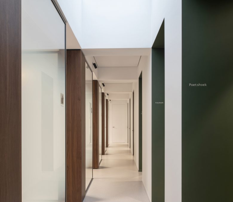 To the right of the reception desk is the visitor corridor, where all treatment rooms and supporting functions are located. The skylight above this corridor not only provides daylight but also subtly assists with orientation. The staff route is separated from the visitor path to ensure that patients and employees do not cross paths. Staff facilities such as the office, storage, and sterilization room are directly connected to this route. Sustainability plays a central role in this transformation. The new additions are constructed using sustainable materials and energy-efficient Mechanical installations. Thanks to an integrated approach, these features have been implemented without compromising the monument’s historical value. Buro/S Architects has achieved a careful balance between heritage preservation and contemporary use. The transformation of Langstraat 79 demonstrates how a historic building can be given a new, sustainable purpose while honoring its past and maintaining its architectural significance. Through subtle interventions and the use of high-quality materials, a harmonious whole has emerged in which authentic elements and modern architecture enhance one another.