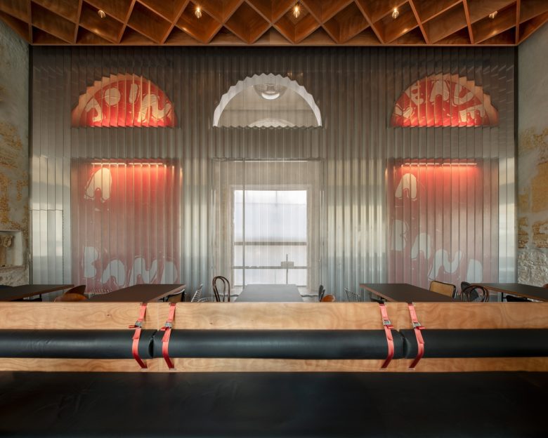 On the right, you enter the main room, where fragments of various historical interventions coexist. This space centers around the theme of theatrical backdrops, amplifying the sense of transition already suggested by the entrance. Historical traces evoke an almost boundless depth, which the design enhances through the placement of a wall conceived as a kind of curtain. This feature, crafted from folded and perforated stainless steel sheets, creates an interplay of transparency, offering an almost illusory glimpse of the grand arches facing the inner courtyard. Temporary posters by artist Stefan Marx, pasted and illuminated behind the pleated metal wall, evoke the theatrical posters of the Belle Époque and seamlessly integrate into the room’s layered narrative and scenic artifice. A refined polychrome mosaic floor is contrasted by an imposing coffered ceiling made of multilayered wood, designed to meet both lighting and acoustic needs. Adjacent to the main room, behind the perforated steel wall with its large pivot door, lies a vestibule—a space of transition and mediation. This area establishes an unexpected connection between the interior of the café and the broader, almost dreamlike world of the birch garden, a space that feels both physical and metaphysical.