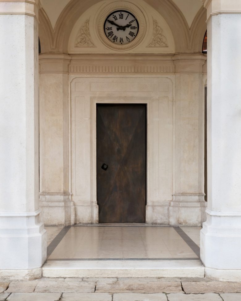 The entrance to the bar is located at the center of the colonnaded wing of the palazzo, designed by architect Antonio Caregaro Negrin and built in the late 19th century. In AMAA’s design, the entrance door is the only opaque element facing the square. Crafted from burnished iron with a pivot mechanism, the door features a distinctive diamond-shaped design, visible from both inside and outside. The handle, made of green serpentine marble from Valmalenco, was custom-designed by the artist Nero/ Alessandro Neretti. To the left of the entrance door, positioned at the corner and at the start of the colonnade, lies the open concept kitchen, fully visible to patrons. A staircase located between the bar and the kitchen leads to the upper dining room, set up as a restaurant.