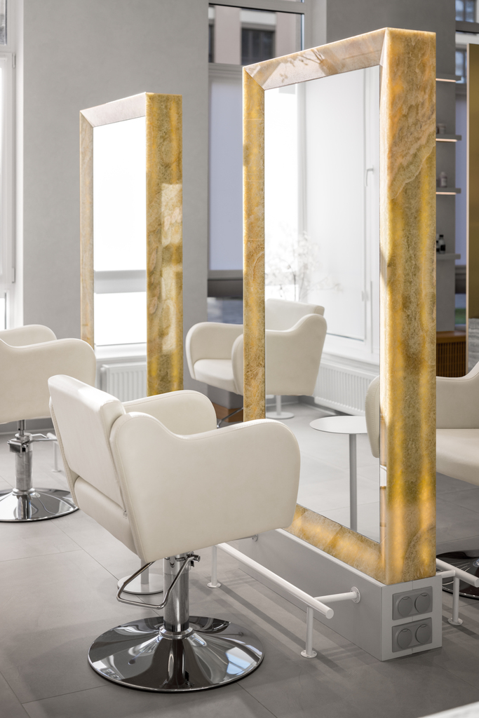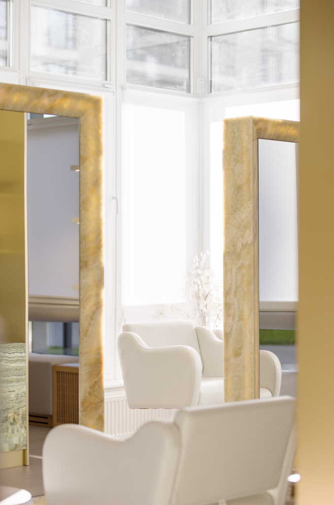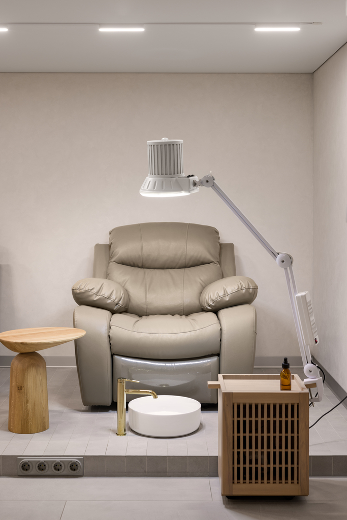 All surfaces that clients come into contact with are made of natural materials. We carefully curated the perspectives from which guests experience the space, ensuring they remain free from unnecessary lines and intersections. This approach fosters a sense of order and relaxation. Even the leg of the large manicure table is made of transparent glass, preserving the lightness of the design.