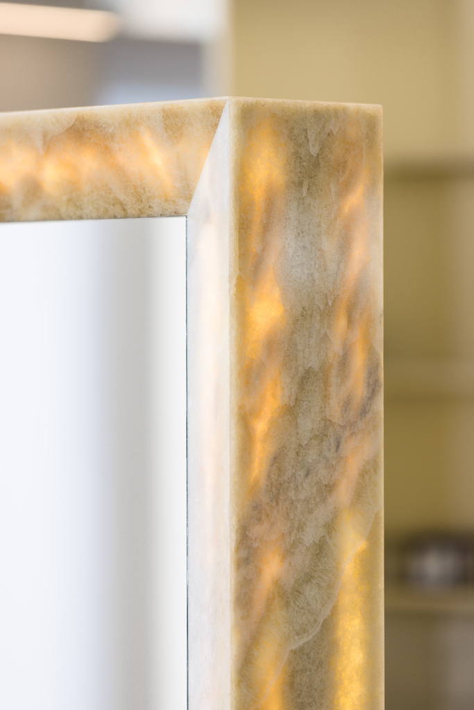 To maintain focus on the onyx without overwhelming the interior, we chose a light gray shade for the walls and floors, featuring a soft matte texture. We also designed and custom-made wooden shelving with rhythmic facades based on our sketches.