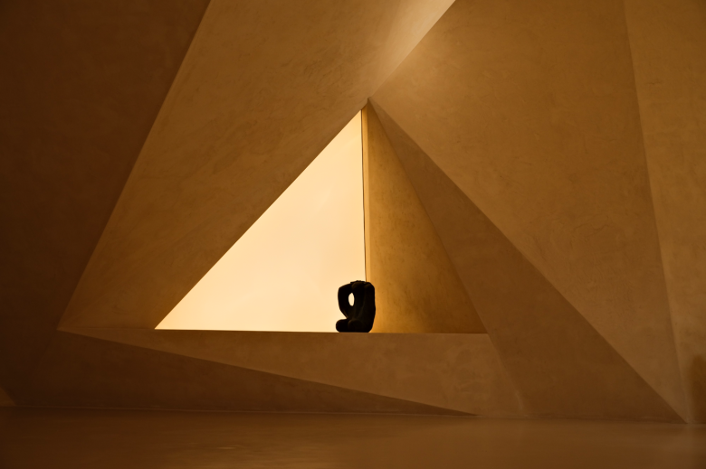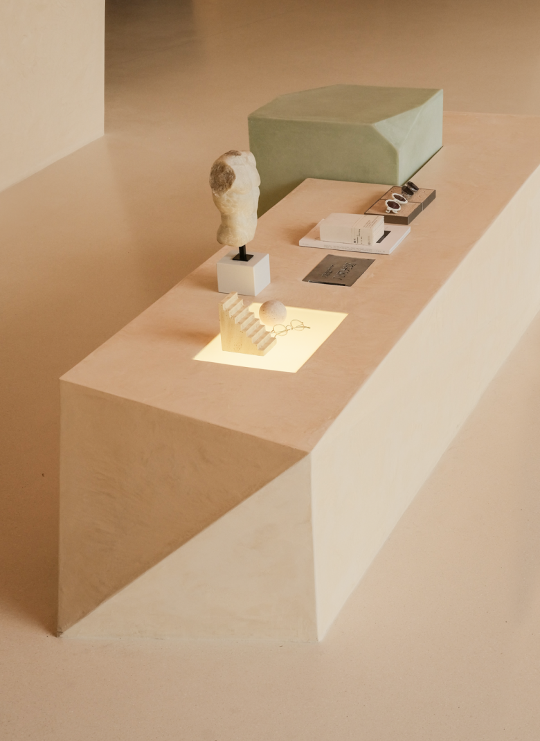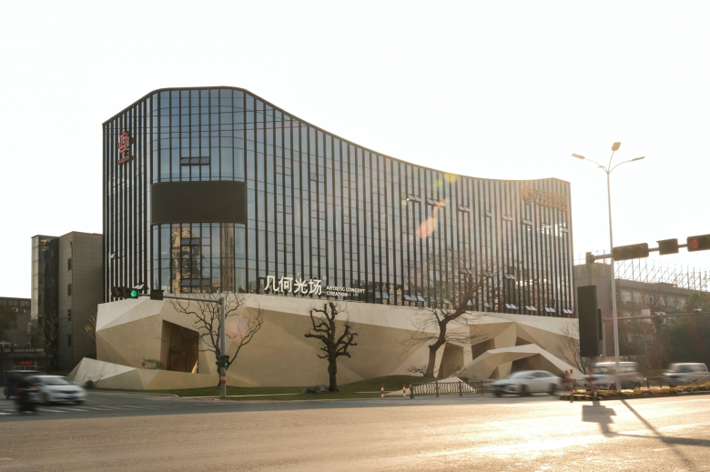The interior embraces a spatially fluid concept, defined by an envelope which seamlessly continues the folded surfaces of the exterior. Soft lighting fixtures, concealed in geometric gaps within the walls and ceiling, accentuate shafts of natural light which enter through large triangular windows, integrated within the angular pattern of the walls. Overall, the flow of light guides visitors through the project’s interconnected spaces, which includes the showroom, reception, a café, and an art bookstore, embodying the concept of a “Museum of Light”. More than a venue for sales or display, the space becomes a recognizable symbol of the city itself.