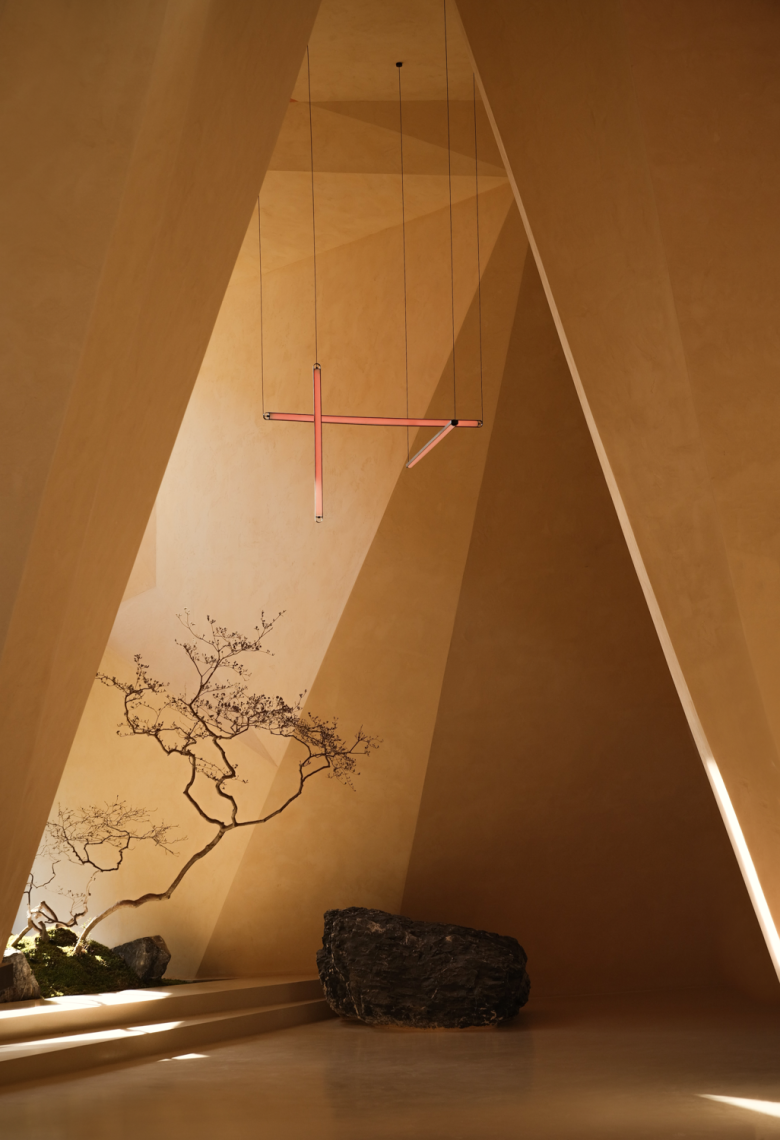 the Fang Eyewear Showroom by architecture firm M-D Design Studio, a project which reimagines the traditional showroom in the town of Mayu, a hub of the eyewear industry in China. The new space presents a bold, sculptural landmark presence while exploring how a commercial space can transform and redefine its role. Its geometric form is inspired by traditional Indian symbolism where triangles represent the future and the essence of creativity and spirituality.