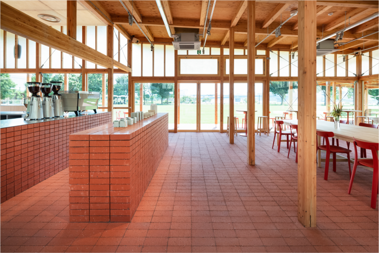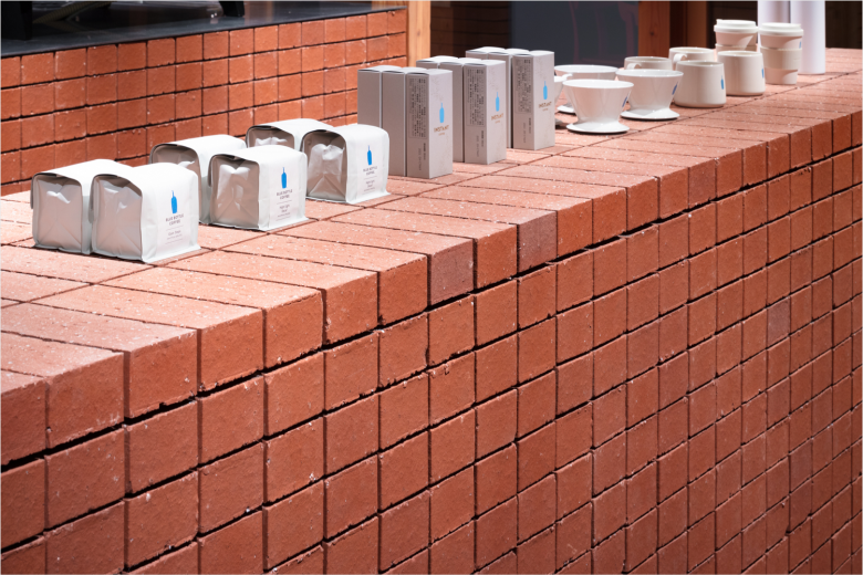 Interestingly, the interior design takes cues from the park’s resting spaces, featuring spacious eaves and semi-outdoor spaces as intermediary places connecting these areas with the café. The building form presents a gradual change of activities from outdoor, semi-outdoor to indoor, and visitors can enter the building from practically all sides. The aforementioned blurring of boundaries is instigated by the abundant use of red bricks for flooring and counters. The upper part of the façade is captured by FRP to seamlessly connect the indoor and outdoor, while bringing soft diffuse light to the entire space, creating a comfortable light environment. Additionally, the material has also been used in the design of the cantilevered outdoor table, which forming an organic continuation between the building and the furniture, and the cantilevered outdoor table. Glass has been used extensively in the area to ensure that the interior of the building can enjoy the sea view without obstacles. The Blue Bottle Coffee café sees a variety of seating areas, from more shaded sections to nooks with sofas and lounge chairs. © superfuture