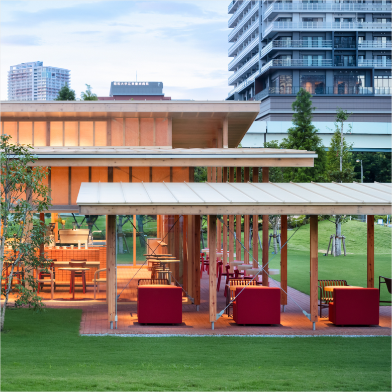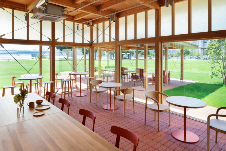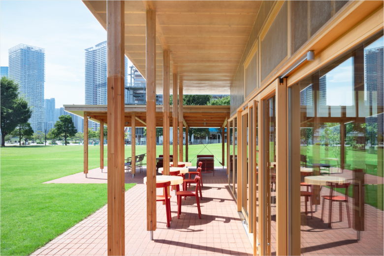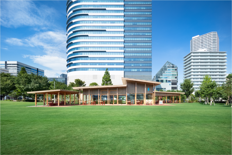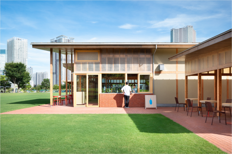 We still remember when Blue Bottle Coffee, the niche American coffee brand, first arrived in Japan a decade ago, opening an outpost in the Kiyosumi area of Tokyo. Since then, the company has quickly expanded across the Japanese capital and beyond. Still finding room for growth in Tokyo‘s sprawling metropolitan area, Blue Bottle Coffee has inaugurated a sixteenth café a little while ago. Situated in Toyosu, an area of town which was once home to shipyards, but is now a sought-after residential area dotted with high-rise apartment buildings. Set smack in the middle of Toyosu Park, a highly popular recreational area, the coffee parlour sits on an expansive meadow, occupying a 279 sqm. (3,003 sq.ft.) wooden pavilion designed by architect Jo Nagasaka of local practice Schemata Architects. Fully adapting to the spaciousness of the open field, the structure has adopted an open, airy design which blurs the boundaries between indoor and outdoor, allowing the greens to be part of the café. The pavilion comprises in fact of four interconnected structures, each with a different size and height.