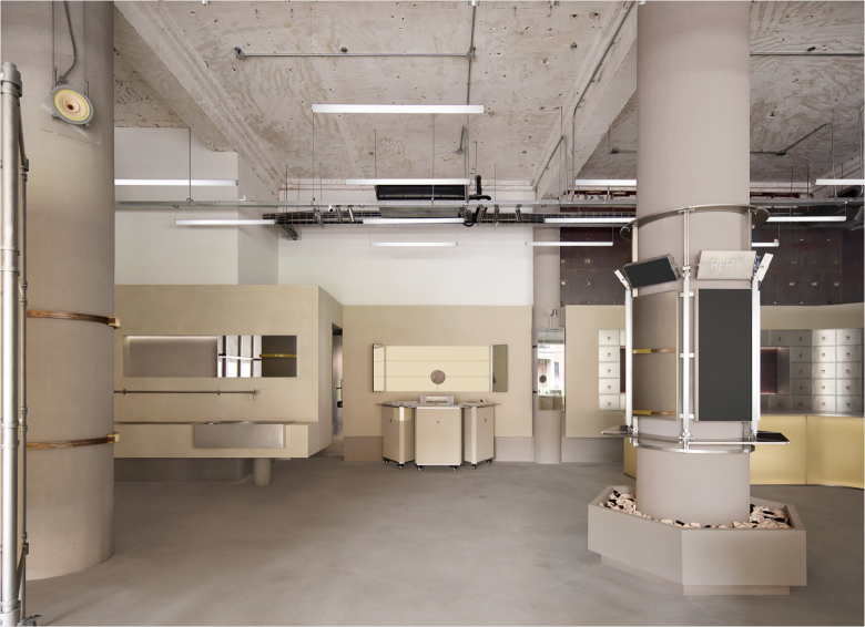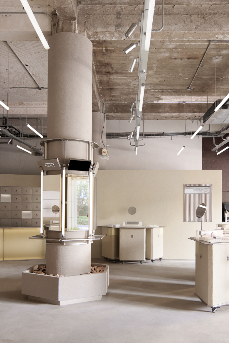 Upon entering RERY Fashion Lifestyle Centre, customers encounter a lighthouse-inspired installation made of yellow translucent resin which serves as a visual anchor for brand identity. Around the lighthouse, three sets of metal display racks present beauty products. For special showcases, resin panel screens can be unfolded and fixed to the wall’s metal structure, providing a flat display surface. Similar nifty versatility can be found in the make-up trial zone where a yellow mobile cabinet embeds into the wall, freeing up floor space to create large gathering areas. However, when extended and anchored to a structural column, its foldable desktop unfurls alongside an integrated mirror, and an intimate vanity space emerges for shoppers who require a private nook..