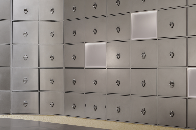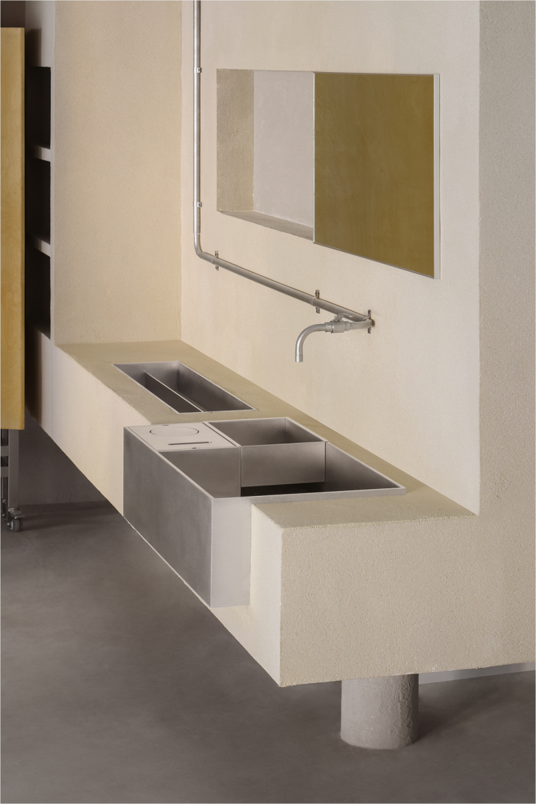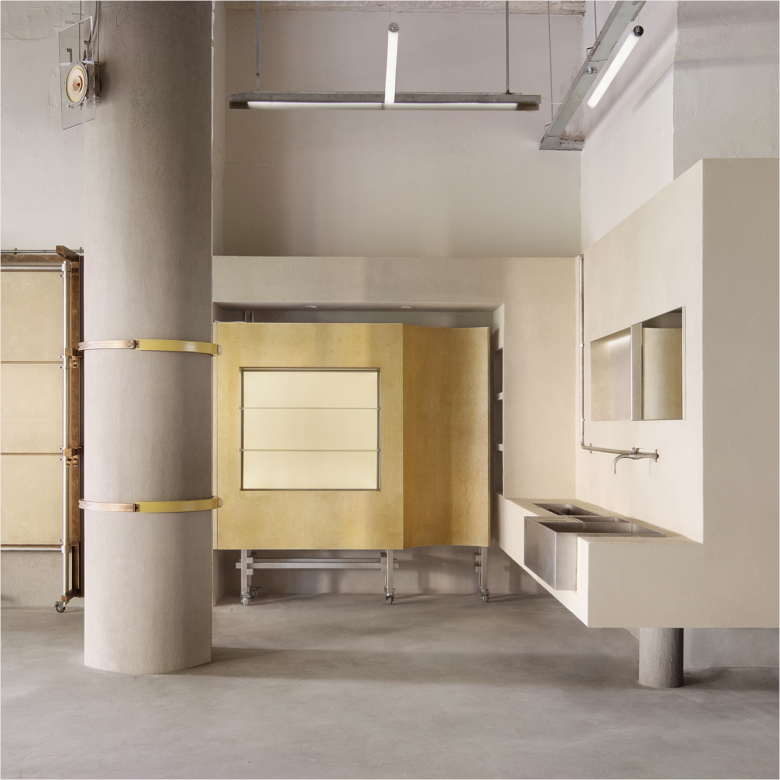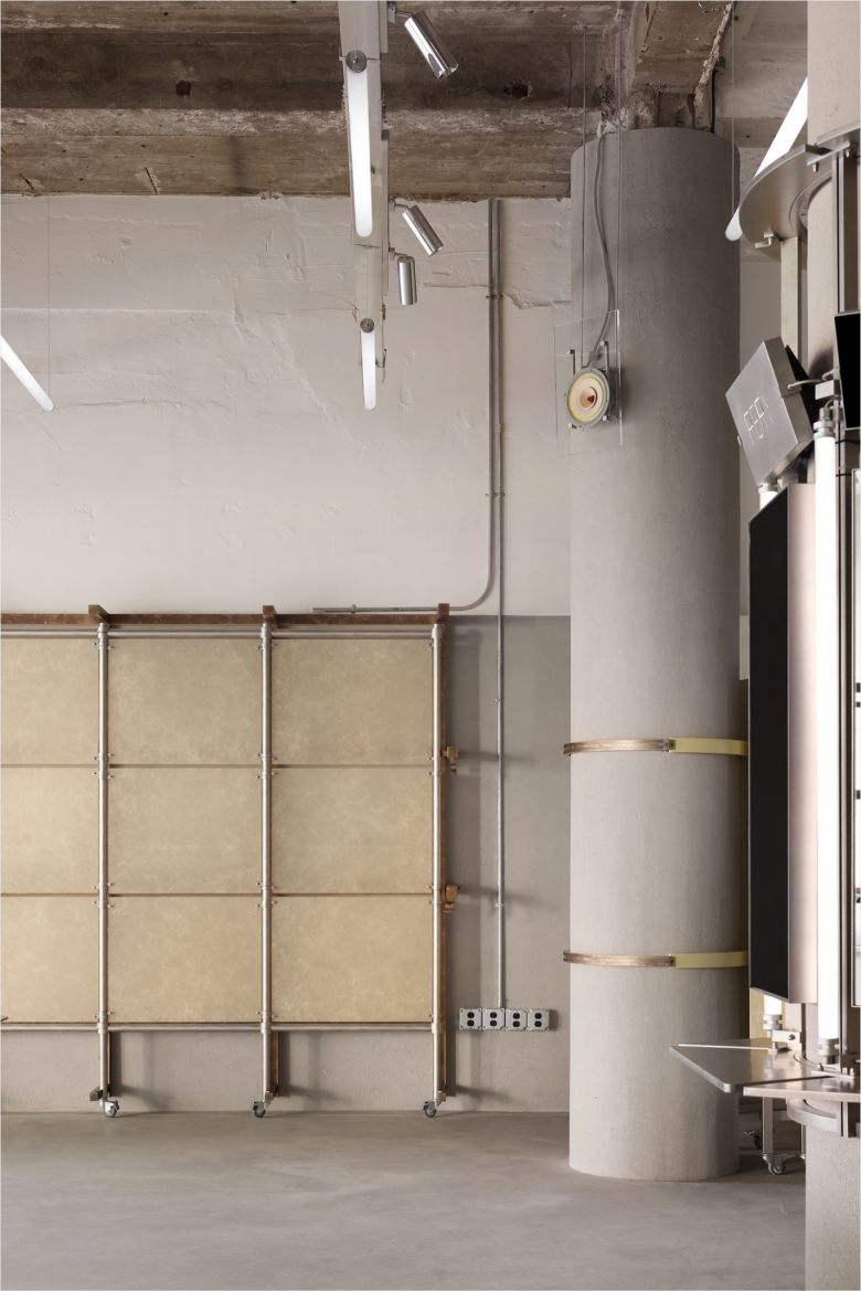 Anticipating the fact that the original enclosed glass windows were flush with the building’s edge, leaving minimal space between the structure and the sidewalk, a trapezoidal transition zone was created, not only widening the street view for passers-by, but also allowing the window displays to unfold gradually. Additionally, a diagonal layout was introduced—the main entrance area was extended into a versatile space for greenery, art installations, or pop-up events, while the coffee window utilised the slant to form an efficient to-go channel. Previously home to a bank, the 148 sqm. (1,593 sq.ft.) space features mottled dark red rusted steel panels and exposed concrete ceilings and floors, and in collaboration with the client, these original elemenst have been retained and embedded in the design.
