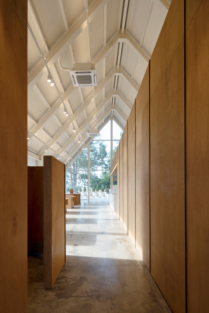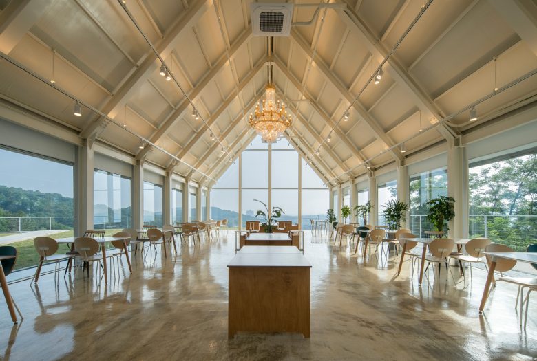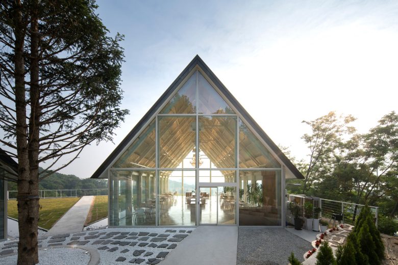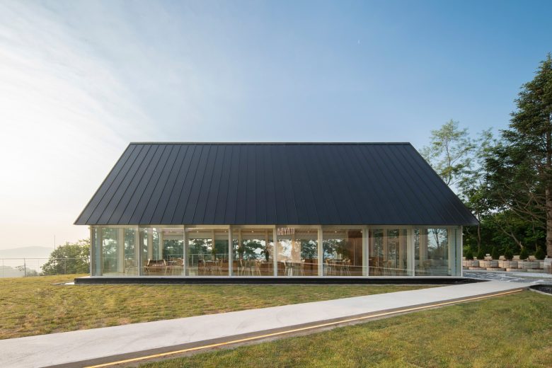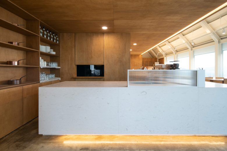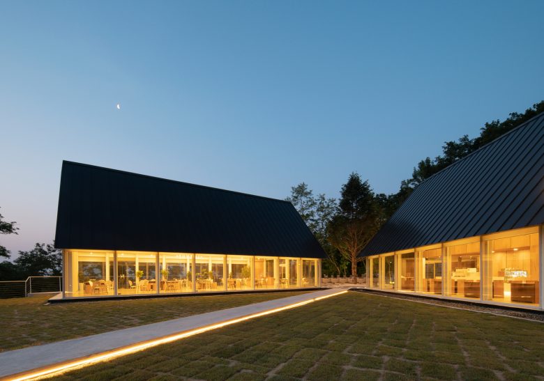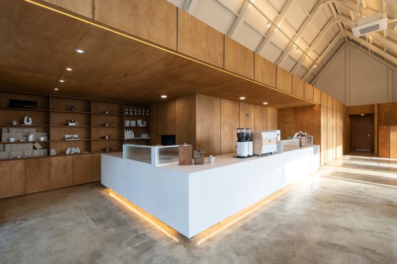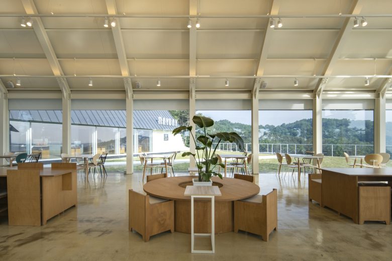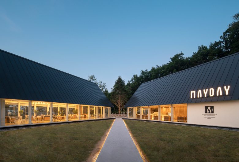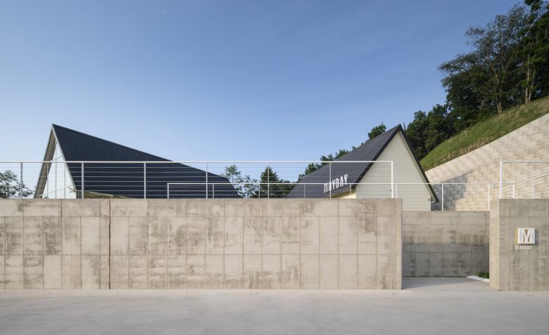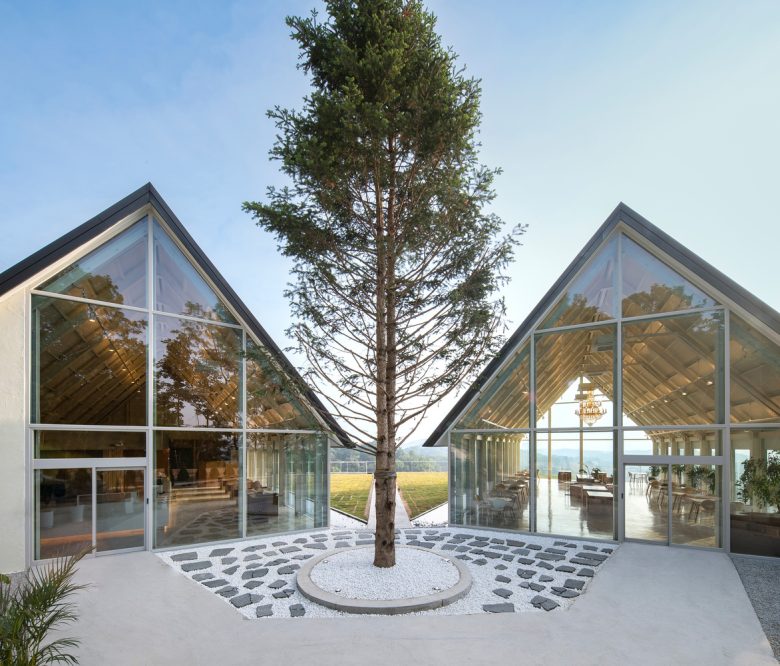 At the end of the path that runs along this tall wall stands a cedar tree named Owolyi, a symbolic centerpiece that encapsulates the form and meaning of Cafe MAYDAY. With two branches extending skyward from a single trunk, the tree appears to embrace the sky. Inspired by this form—and the client’s wish to offer a space of complete rest—the architecture was designed to echo its shape. Positioned at the highest point of the village, the space invites visitors to look out over nature and reconnect with the…