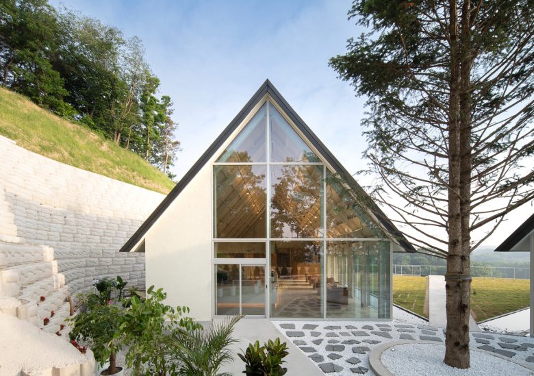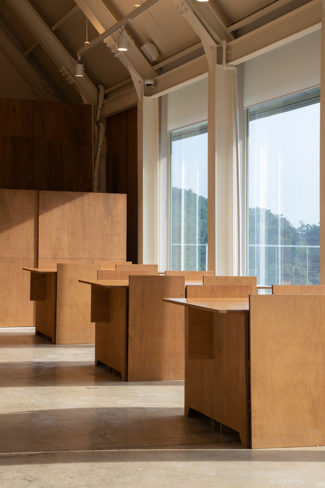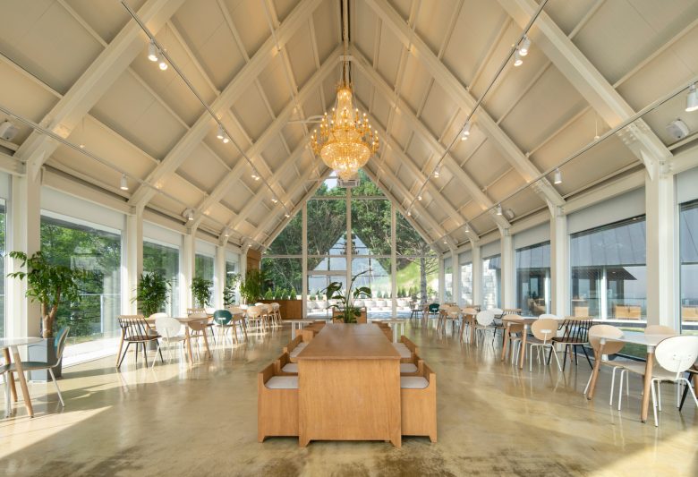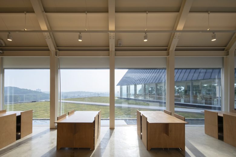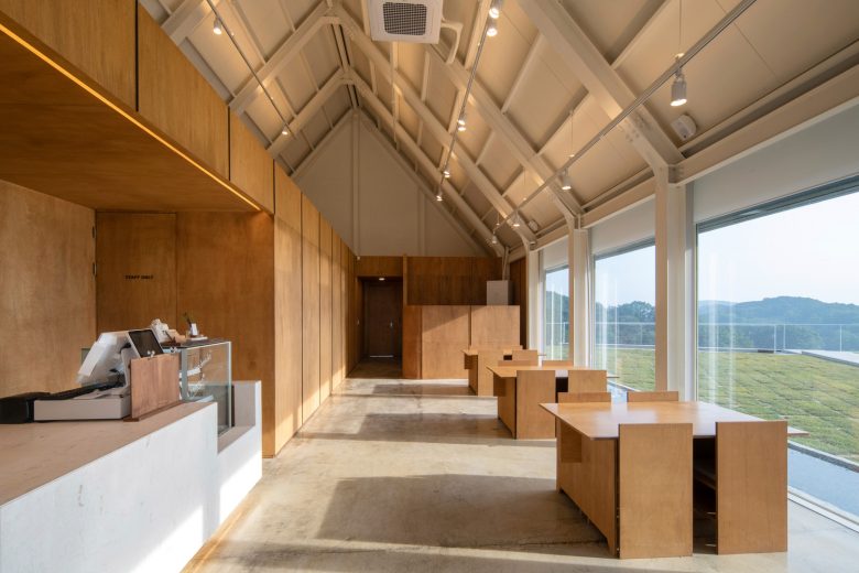 Tranquil pools of water placed on either side of the building reflect the ever-changing sky, capturing the shifting colors of time and wind across their surface. A large window beneath the grand roof fully frames the sky and scenery of Taepyeong-ri, while lower side windows bring in natural light that transforms with the seasons. The soft warmth of wood, combined with white spatial voids, creates a soothing and serene atmosphere.