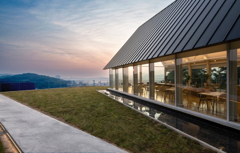 The site sits near the trailhead of Daemyeongsan Mountain and bears marks of disrupted topography from development. To conceal the contrasting retaining soil, Building A was arranged to house the kitchen and staff areas, while Building B —with windows on all four sides— opens up to the ridgeline of the mountain, offering generous views. The interiors are finished with stone and wood, materials once native to the land, as a gesture of homage to the lost nature of the site.