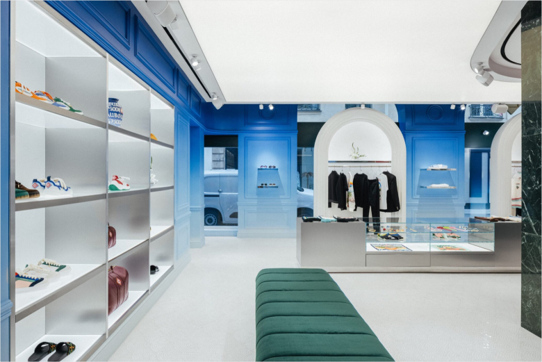 Furnishings and fixtures include a series of display units which mimic the large arched windows, matching sleek furnishings, a wall-mounted display of white marble and lacquered timber which is inspired by a tennis court and Carlo Scarpa’s architecture, two of Tajer’s avid interests. In contrast with the gradient blue walls downstairs and all-white upper floor, the basement section is mote intimate, featuring carpet flooring in green which even runs up the walls where it’s met by shiny metal panels. Similar to the upper floors, large ceiling lights optically enlarge the setting. The new Casablanca store carries the brand’s full range of men’s, women’s and kids apparel, accessories, bags, shoes, eyewear and jewellery pieces. Mind you, the brand’s next retail space is scheduled to open later this summer in Los Angeles, while more stores are planned in other global shopping destinations. © superfuture