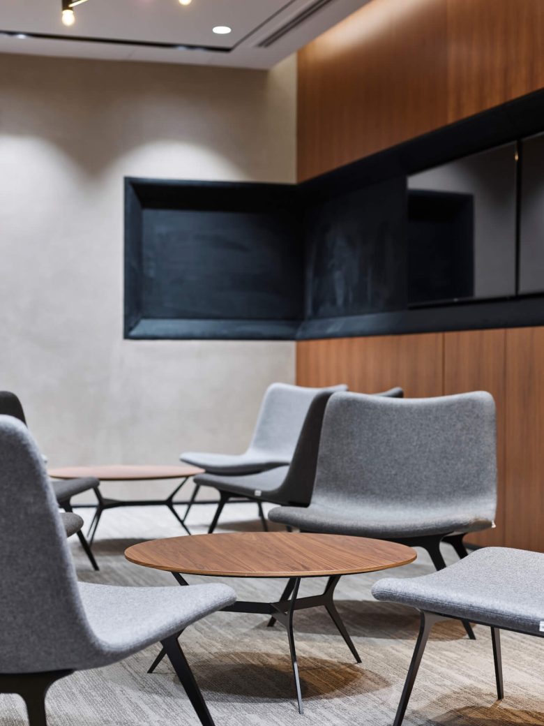 When TECOM decided to renovate their Management offices in Dubai Knowledge Park, the brief was to create a contemporary space aligned with TECOM’s future vision, incorporating wellness principles throughout. The original space had limited natural light, so window openings were enlarged to invite more daylight. Biophilic design was introduced with live plants integrated as key design elements. The result is a cohesive, harmonious environment that balances aesthetics with functionality. A major challenge was combining a welcoming reception area with a practical office layout. Multiple revisions were made before final approval, as the design-savvy client sought uniqueness and innovation. A chic palette of greys and deep wood tones was used, complemented by textured materials in similar hues for visual interest. Swiss Bureau introduced tinted glass partitions to enhance privacy while adding design flair. Flooring transitioned across zones—soft carpets in workstations and meeting rooms, patterned tiles in the pantry, and rugs in the Majlis. Walls feature linen-textured wallpaper and concrete finishes for contrast. The Reception/Lounge integrates the company logo with a planter wall, dividing the office into a Meeting Zone and Main Office Zone. Meeting areas and a Majlis feature wood panels and metal lighting, while the open office and pantry include accent colors to energize the space.