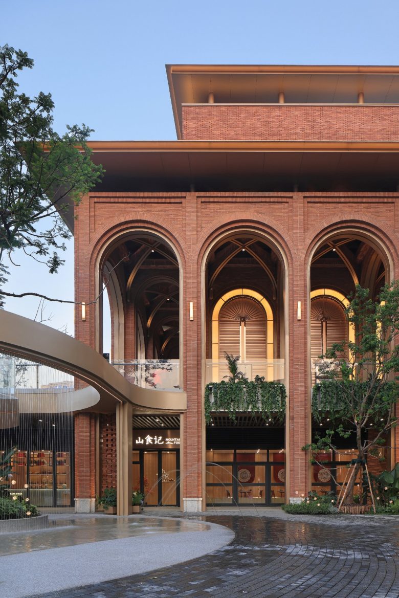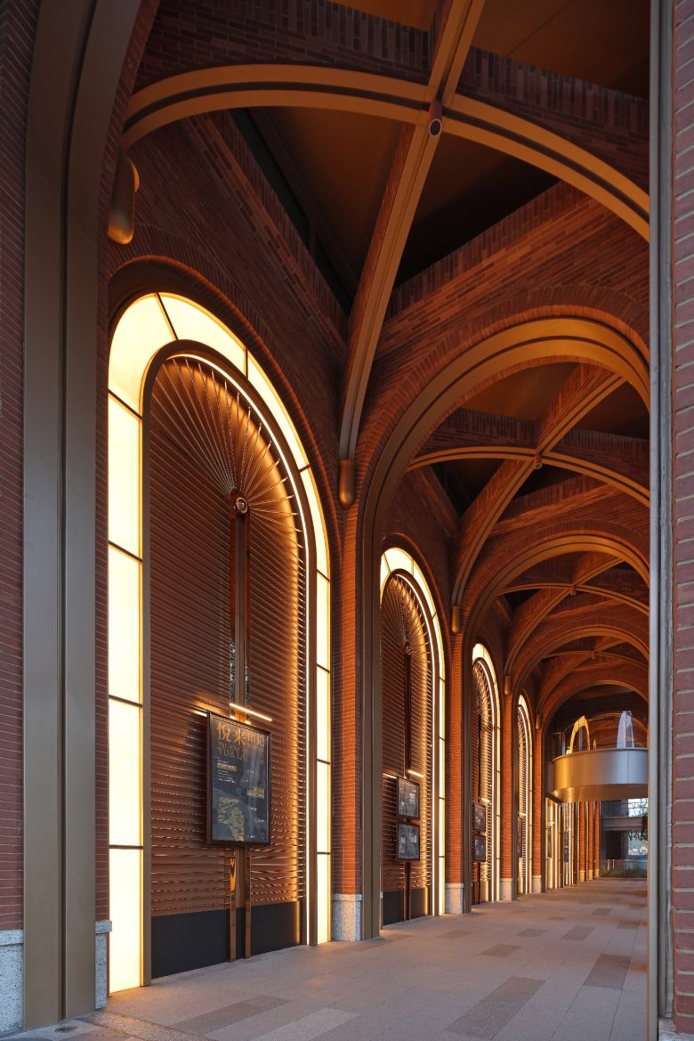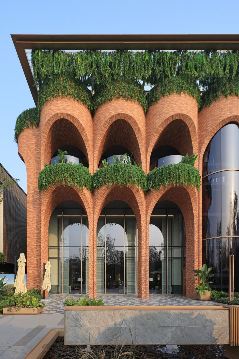 The sales center façade combines red brick textures with metal mesh and glass to evoke the district’s heritage and renew its identity. Layered arches, graphic decals, and sculptural forms add depth and artistic character, striking a balance between tradition and modernity.
