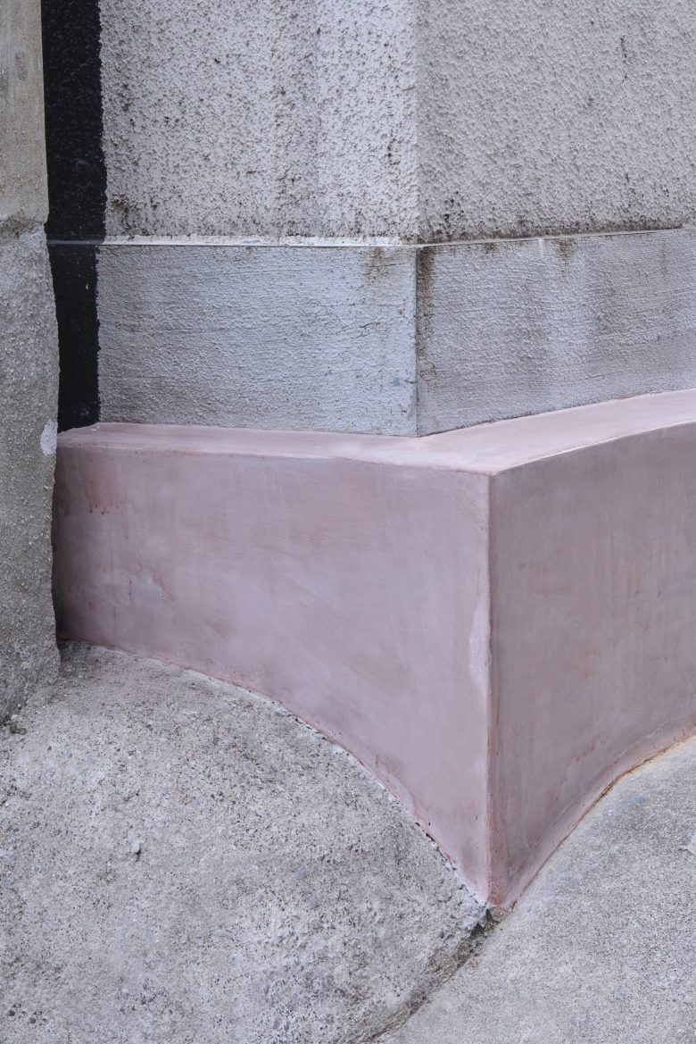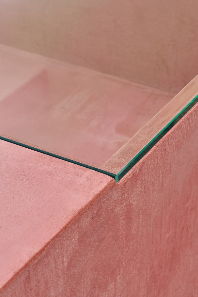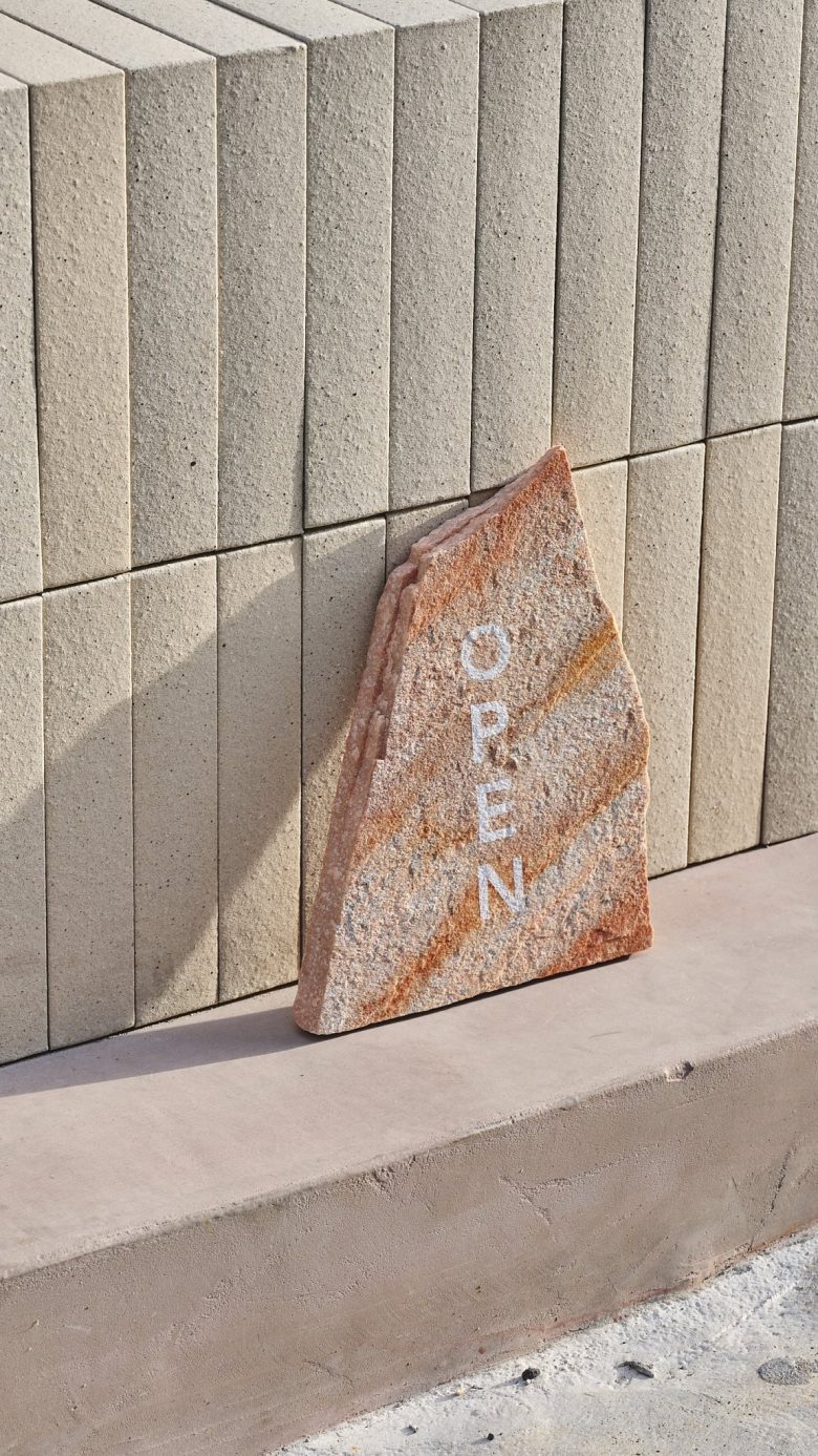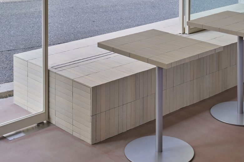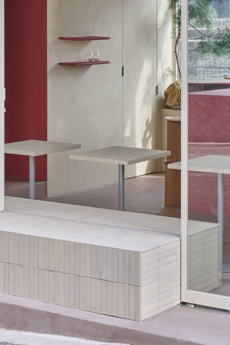 Mino ware tiles with uneven color are used for both benches and tables without being limited to specific functions, and the walls are finished with a plastering finish in the same color range as the tiles, creating the same texture with different materials.