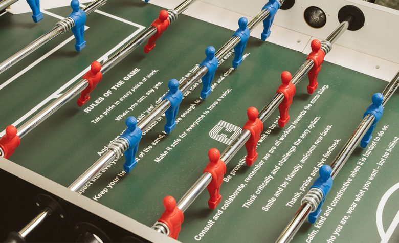 A hand-painted timeline, gold-leaf values, and pearl-detailed lettering embody their Human First ethos. Even the beloved table football was branded with their “Rules of the Game,” immersing the team in their way of life.