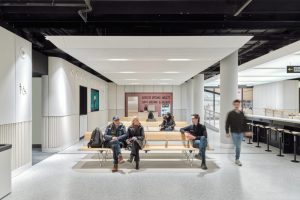 The design team has collaborated with expert craftsmen, such as Ceràmica Cumella for the coloured façade pieces or Ondarreta, which supplied furniture made from certified wood and recycled fabrics. Sustainability guidelines were defined with the support of companies specialising in waste management: CoCircular, whose advice informed the entire process; and the manufacturers, Honext and Gravity Waves, who provided, respectively, partition panels made from recycled paper and interior finishes made from plastic recovered from fishing nets.