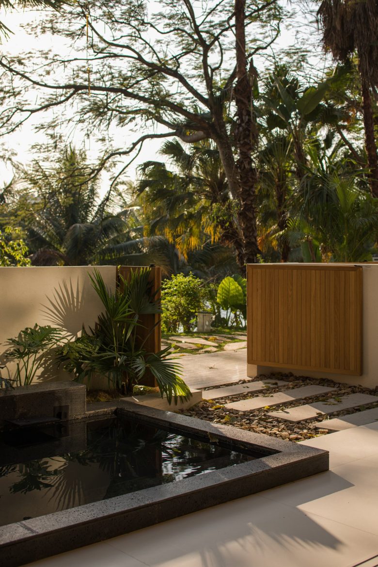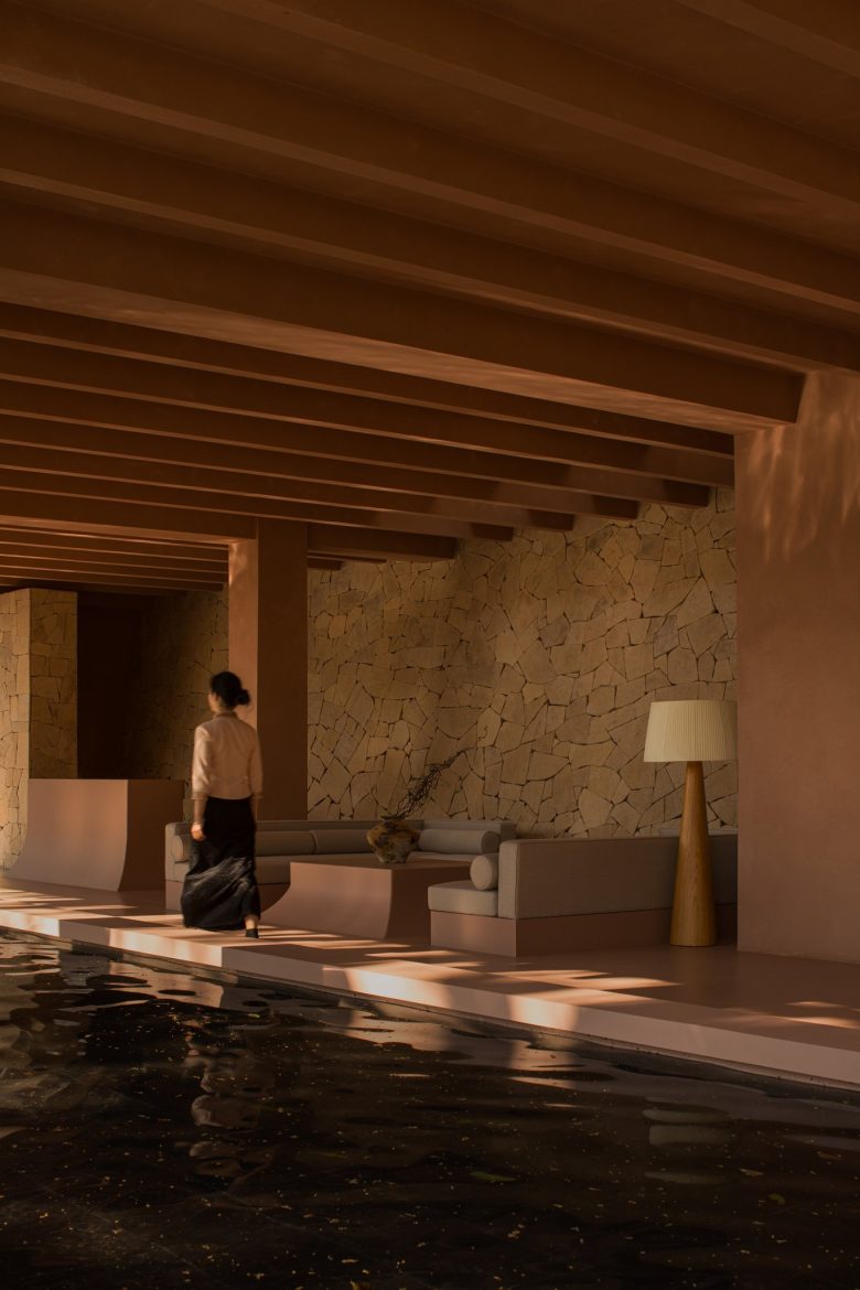 The architecture cascades along the hillside like stones resting in the forest. Centered around a serene swimming pool, the layout features “mountain-shaped” volumes unfolding symmetrically, while water features flow gently through, blurring boundaries between built and natural.