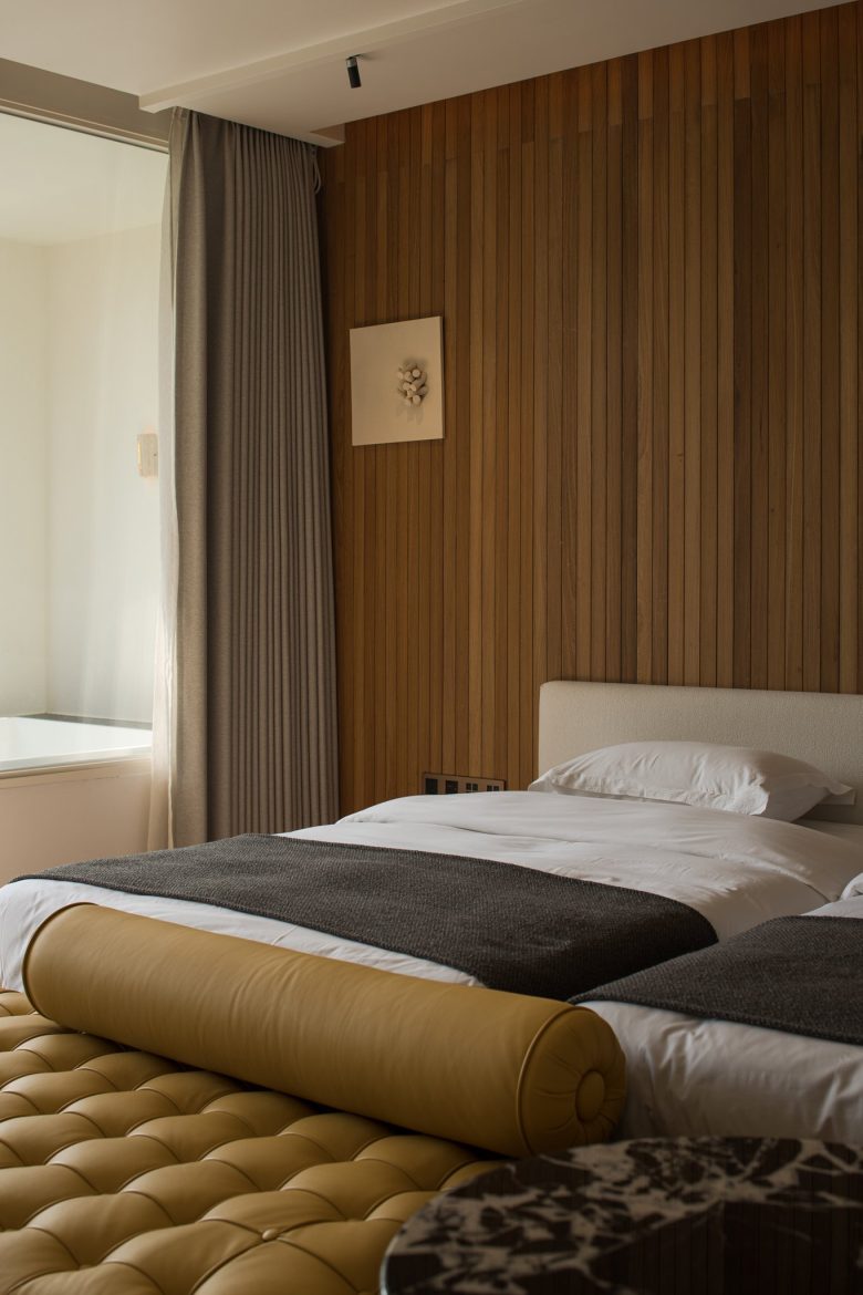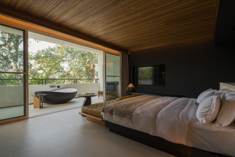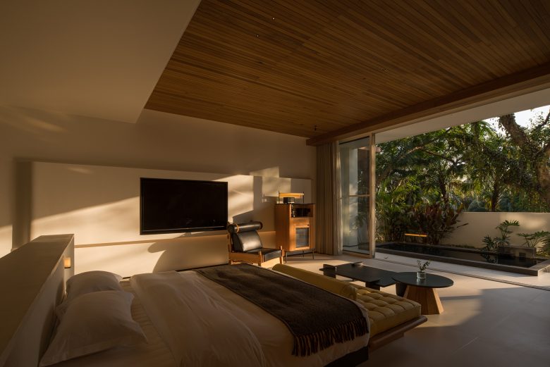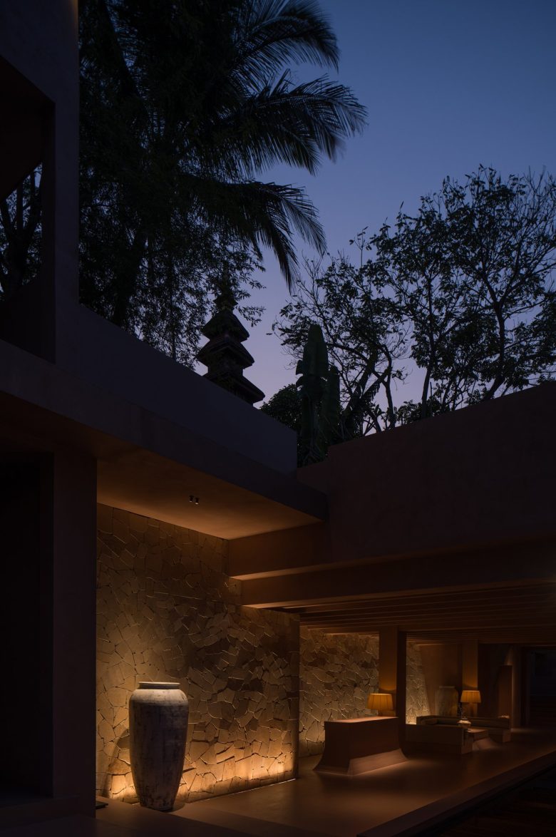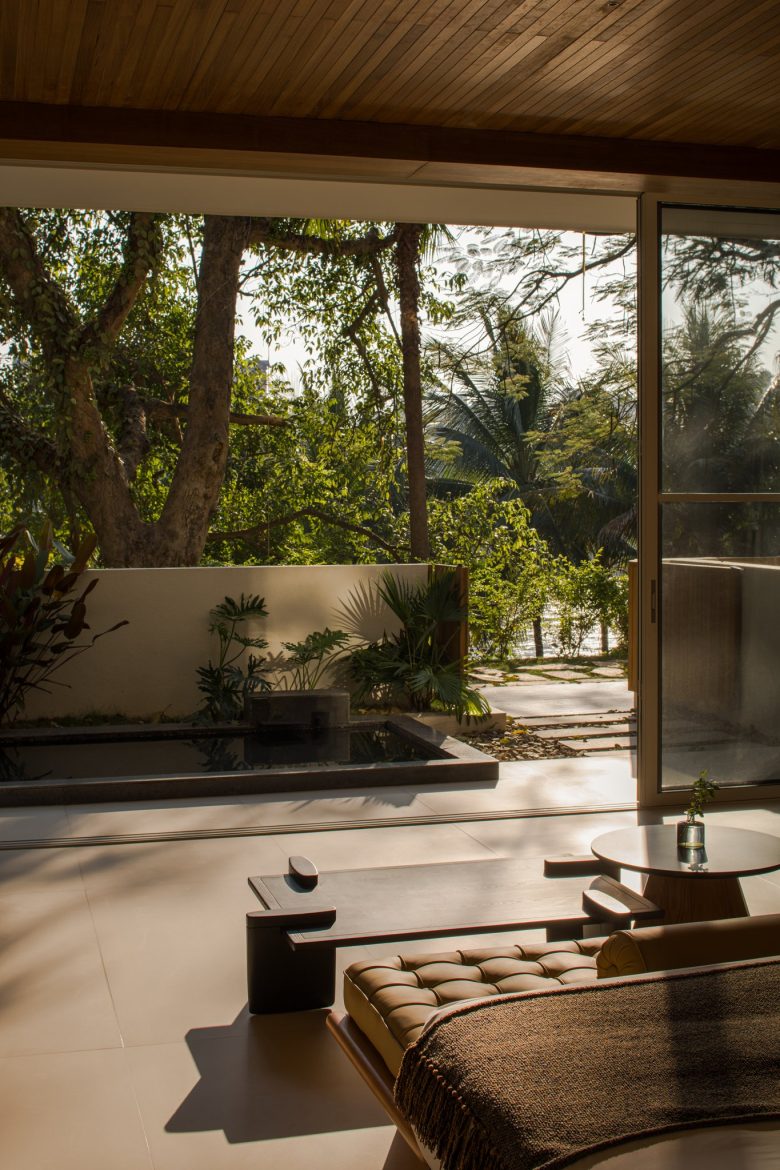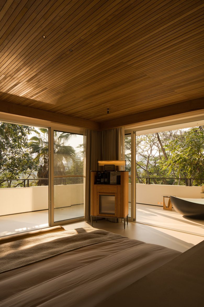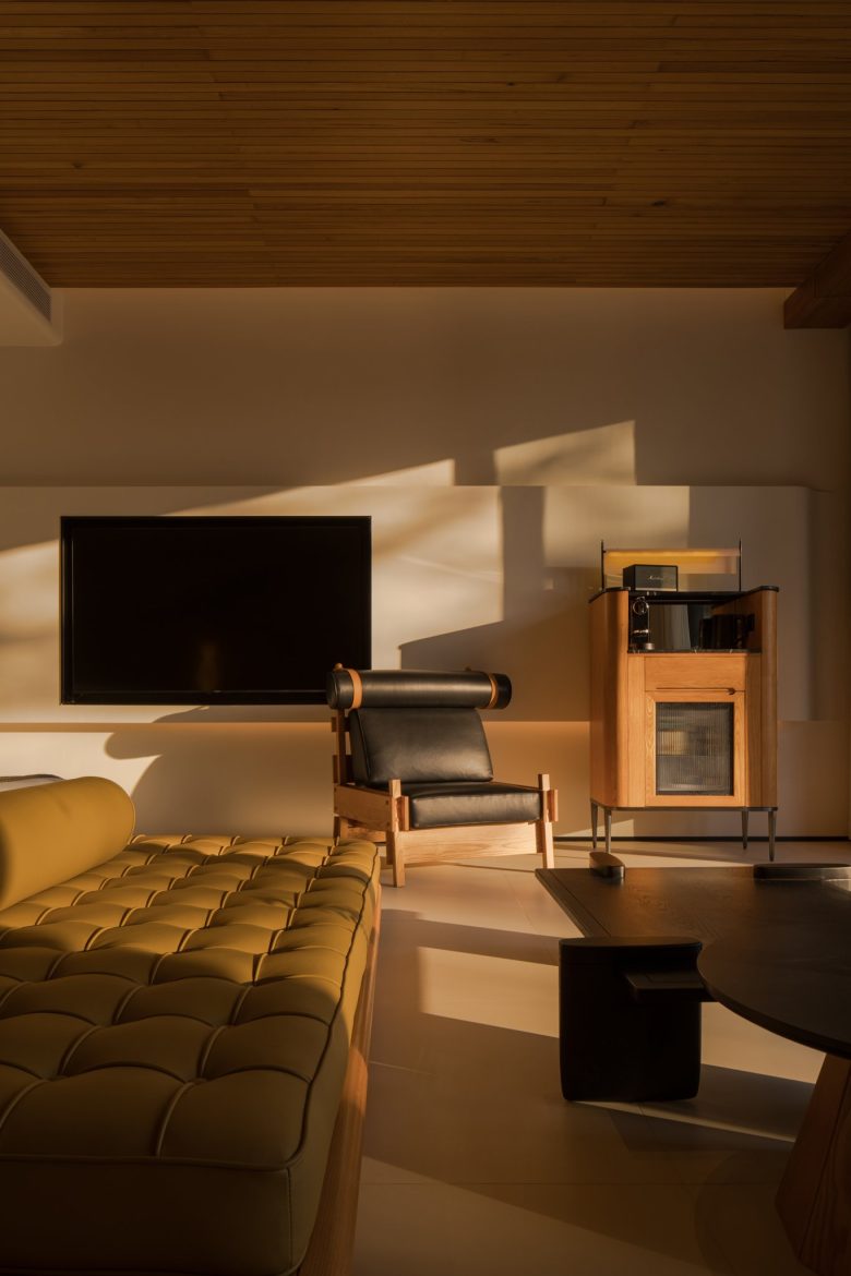 Ground-floor rooms offer private gardens; upper-level suites frame sweeping views through floor-to-ceiling windows. Aged wood, natural textures, and thoughtful simplicity root the space in calm. Suspended above cliffs, beneath violet skies and ancient trees, the resort becomes a place of inner stillness—where the spirit rests, and the self returns to balance.
