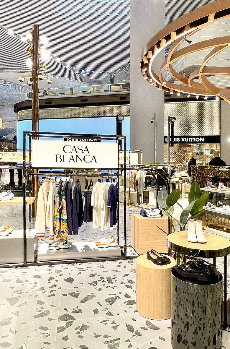 PLAJER + FRANZ designed a premium multi-brand concept at Istanbul Airport in 2023 with Gebr. Heinemann/ATU Duty Free. The “Luxury Square” sits in a prime spot past security and invites travellers into an open, bazaar-like space under tree-shaped light structures. Phase one showcases luxury accessories, leather goods, watches and jewellery. A sunglasses display forms the centrepiece, with brands like Dior, Givenchy, Burberry, Chloé and Saint Laurent staged on polished brass fixtures. Beige and dark brown Turkish marble highlights brand zones, while large screens outside and small monitors inside enhance the experience.