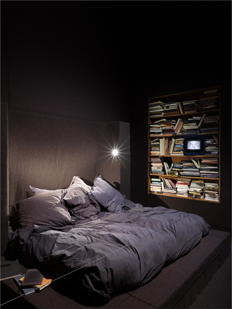 Additionally, a series of works by artists Gustave Moreau, Joseph Beuys and Steven Parrino provide insight into the designer’s many sources of inspiration, and obviously will show his work in a new light. Needless to say, the exhibition also sheds light on Michèle Lamy, the designer’s wife and business partner, and the influential role she plays in his creative output. The recreation of their old Californian bedroom symbolises this symbiotic bond. As said, the show extends outside, where tall statues wrapped in a sequined fabric lines the façade, while the garden, planted with Californian vines and plants, Owens’ fav greens, is dotted with specially designed Brutalist-style cement sculptures (on through Jan 4). © superfuture